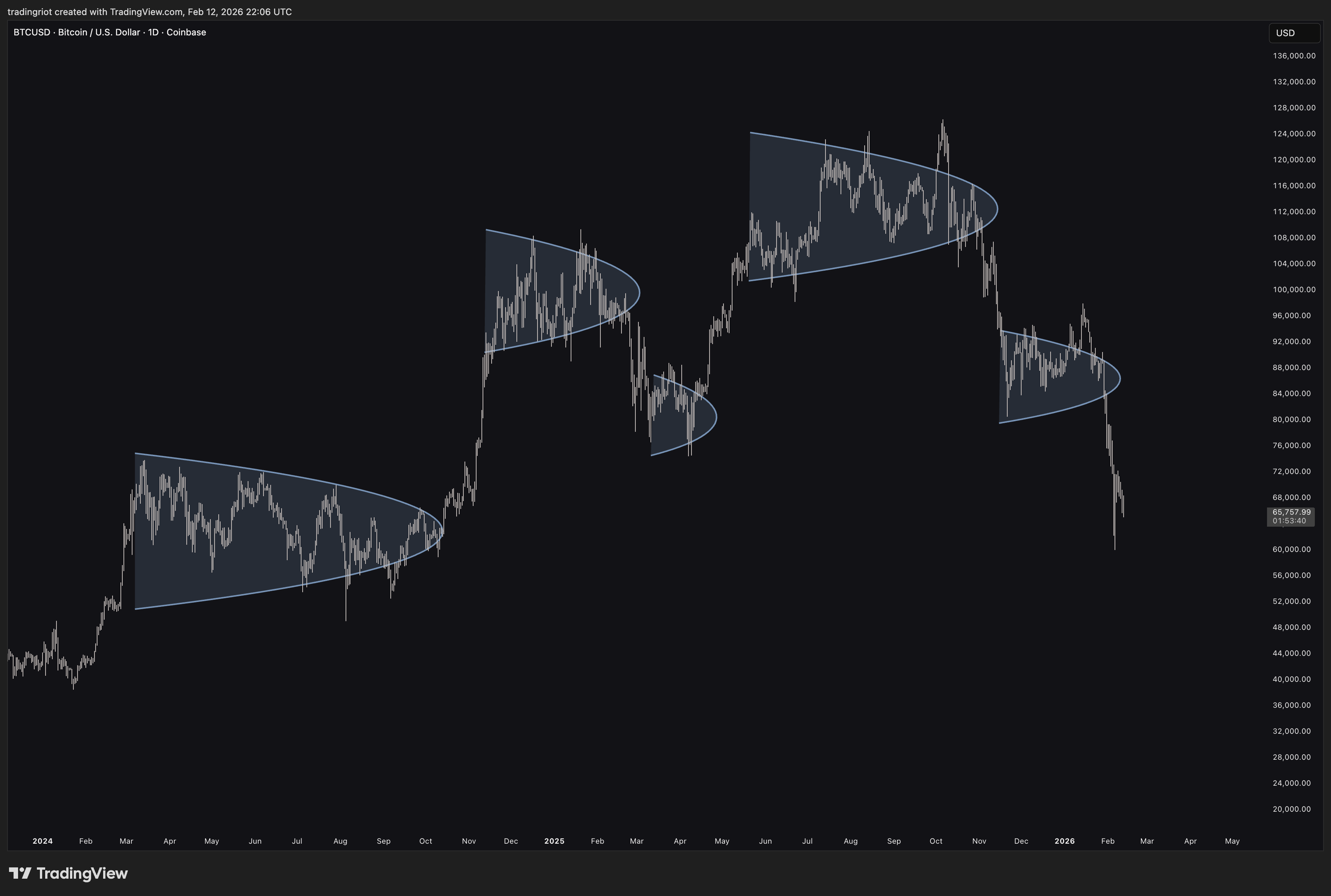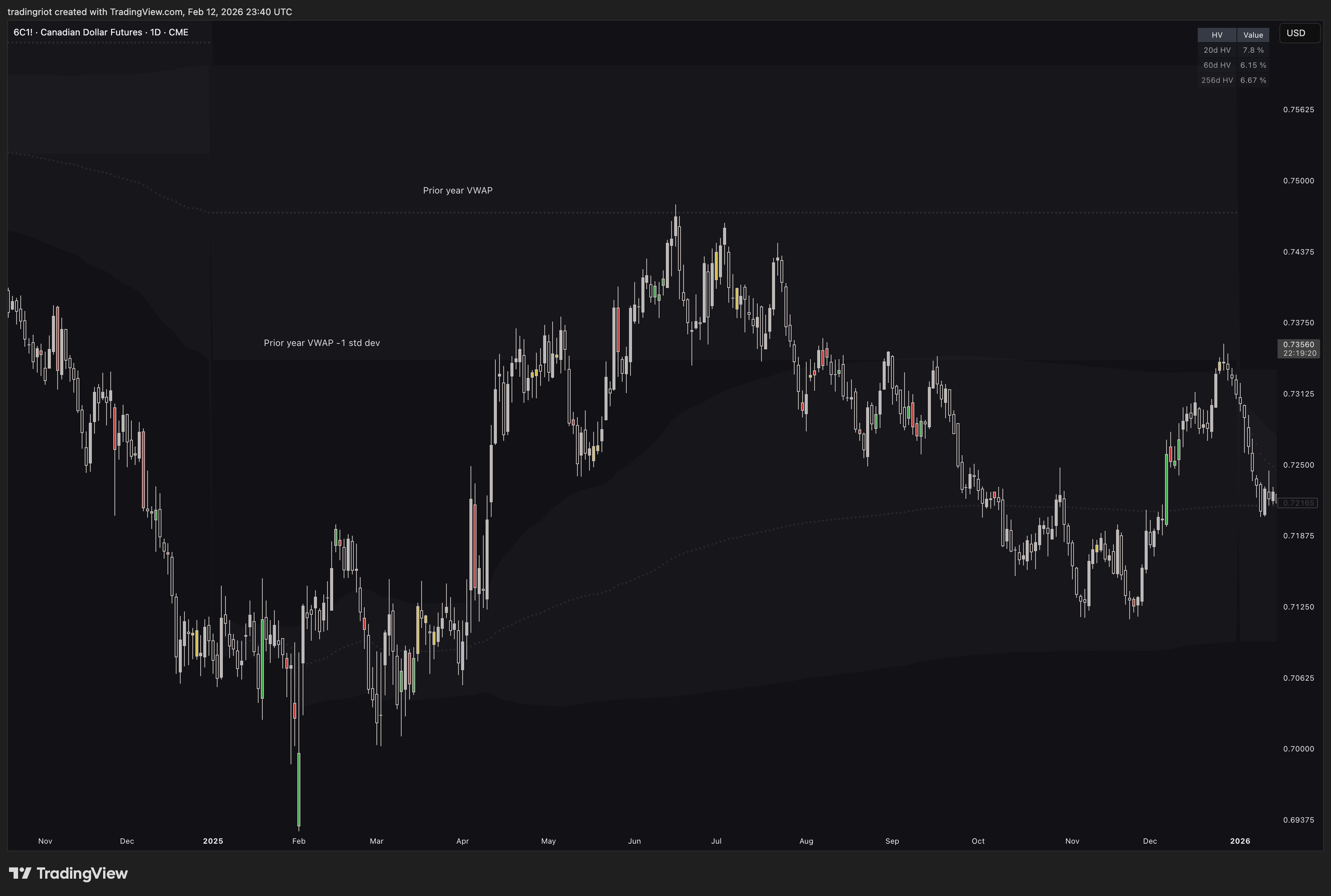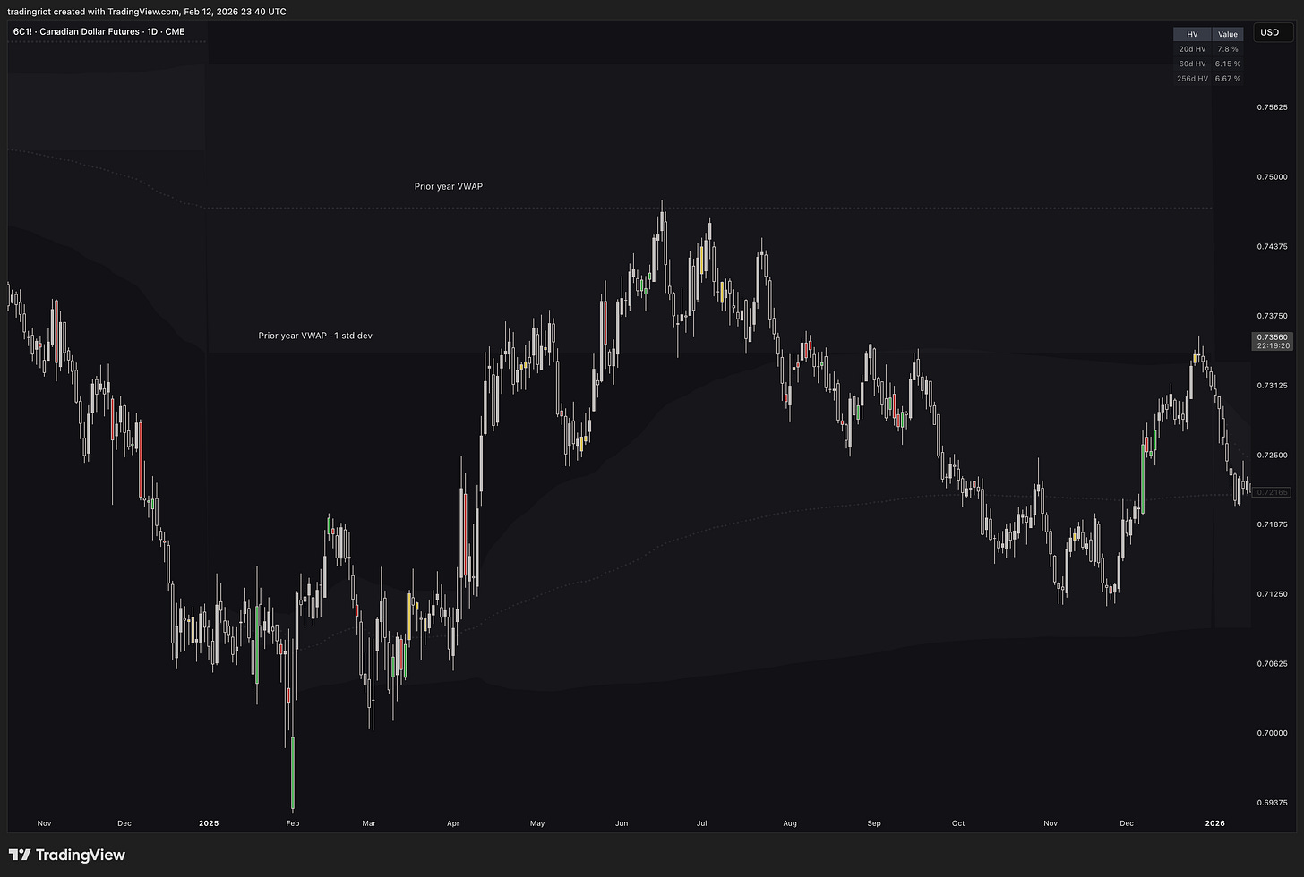 As you can see on the chart of Canadian dollar futures, the yearly VWAP is used, therefore each VWAP represents one trading year.