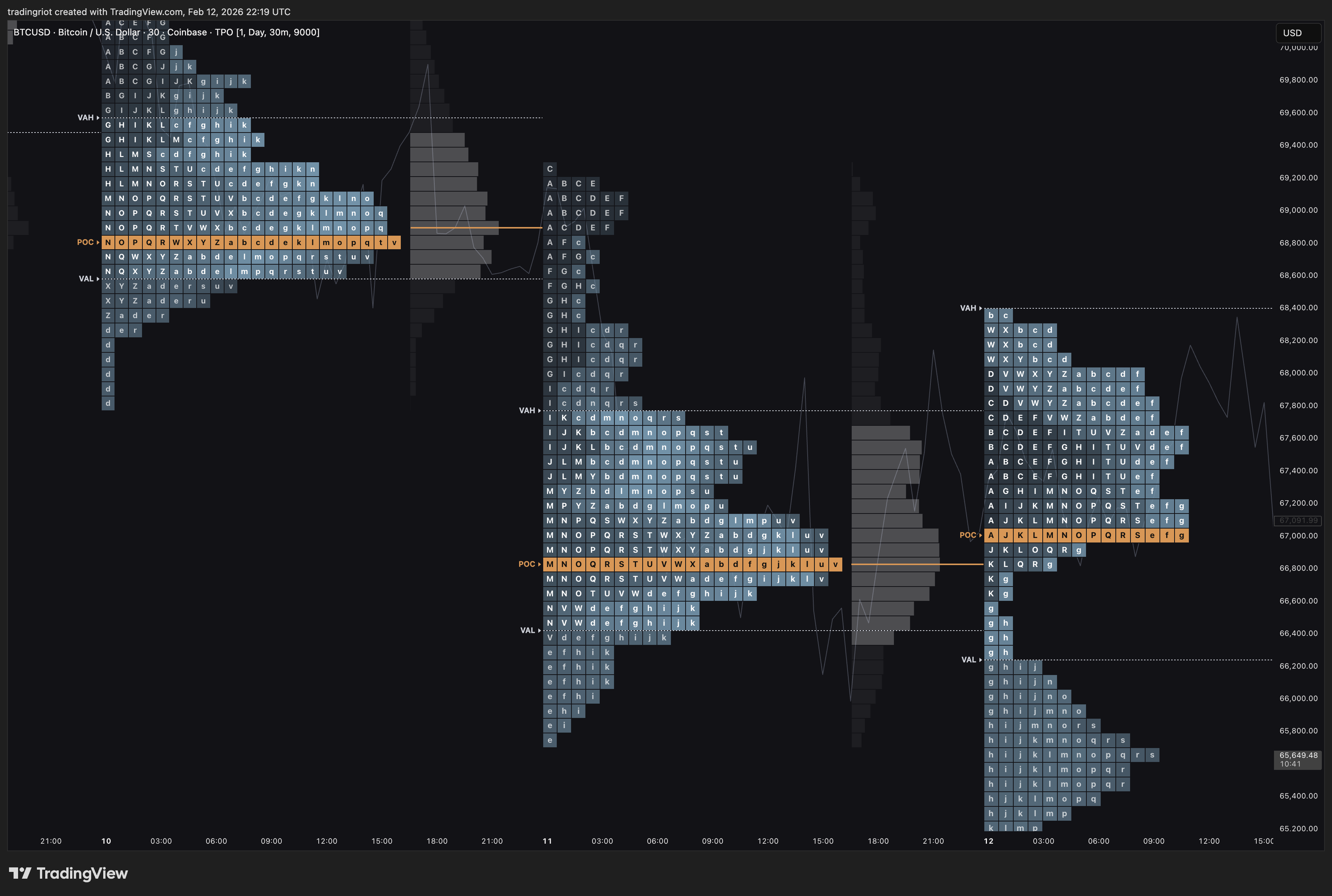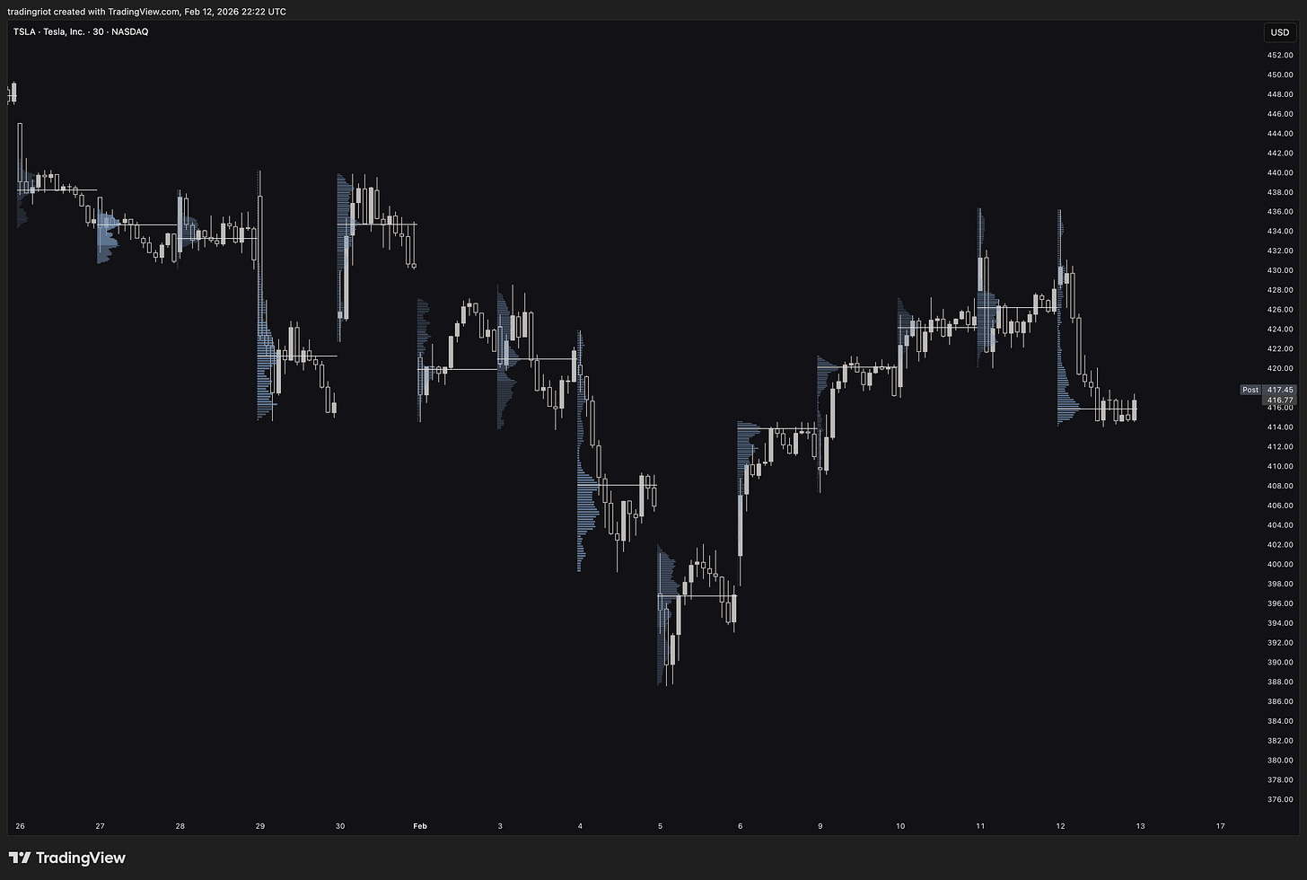 Instead of candlesticks, you see strings of letters. Each string of letters represents one 30-minute candle. After the trading session is done, you can collapse all letters to form a bell-shaped distribution.