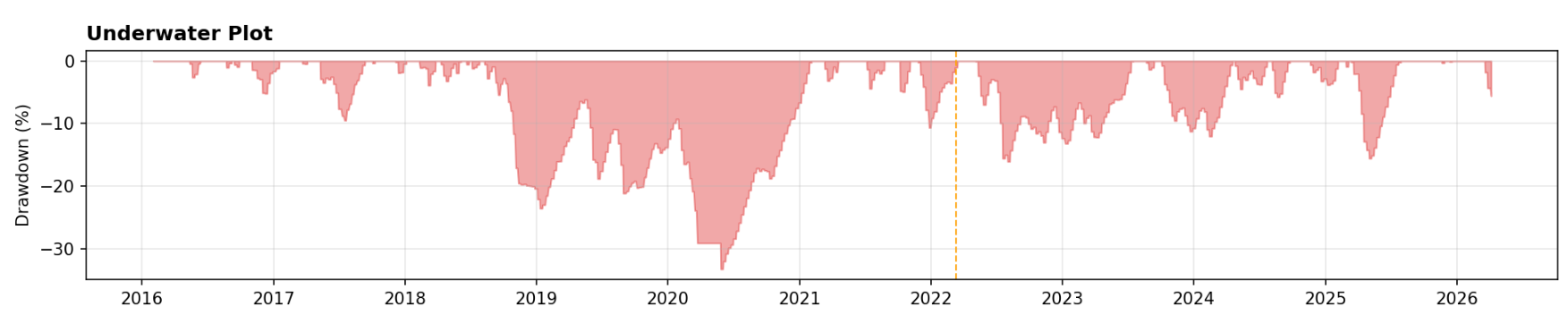 Max drawdown hit 33.3%, which is not nothing. The Sortino ratio of 0.73 and Calmar of 0.54 reflect that. When this thing bleeds, it bleeds.