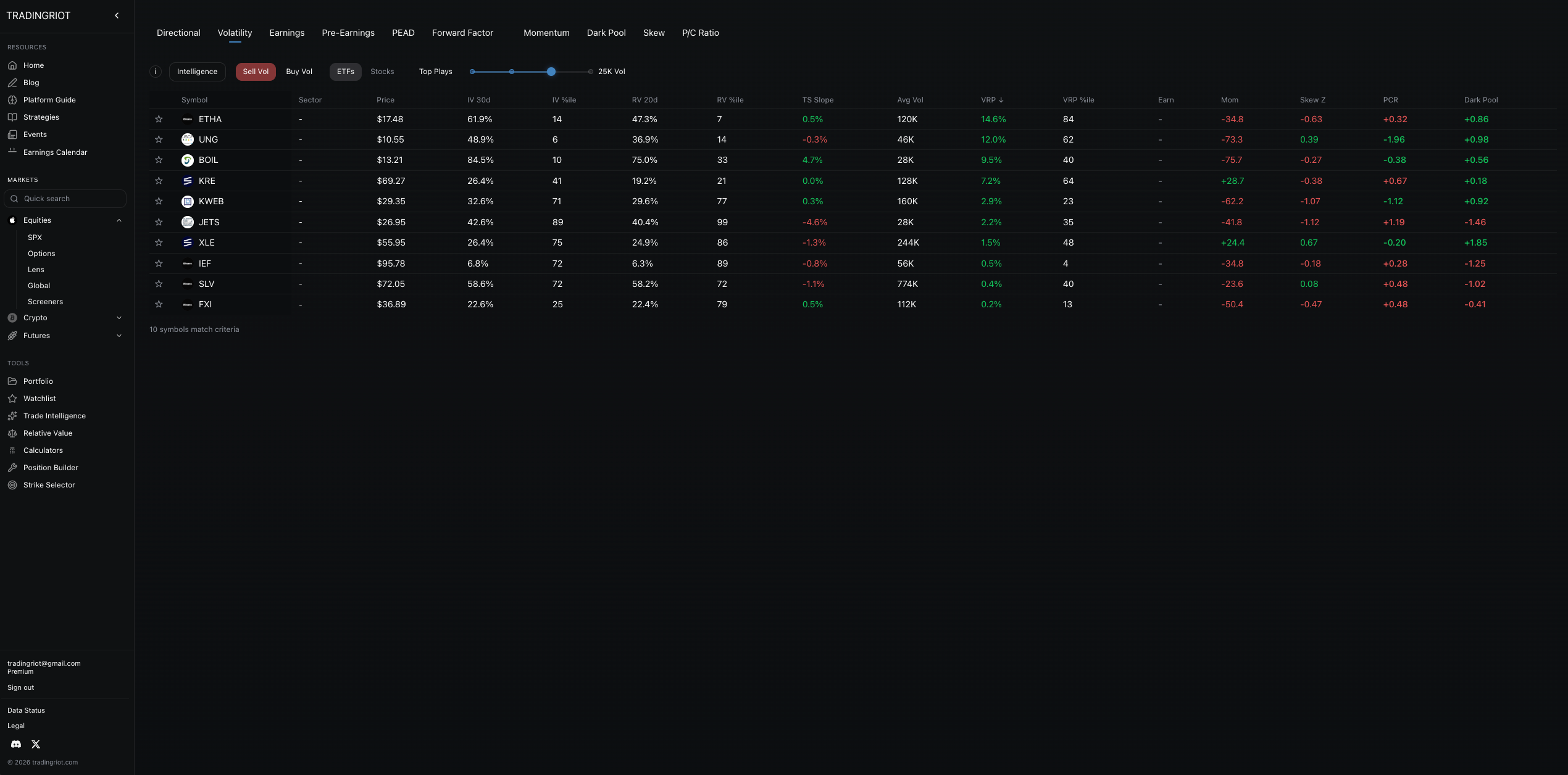 Every Monday, look at all ETFs with more than 25,000 average options volume over the last 20 days.