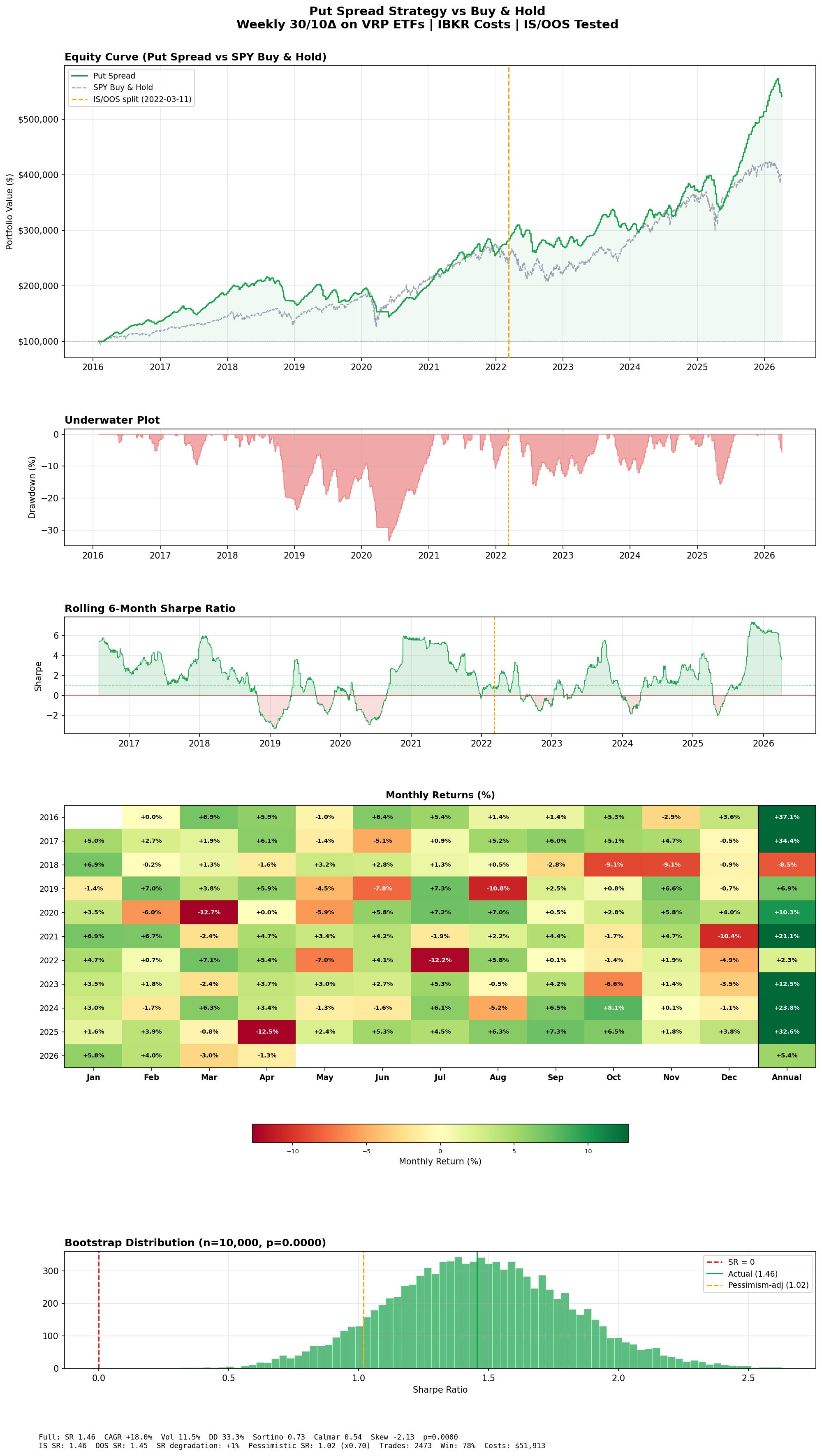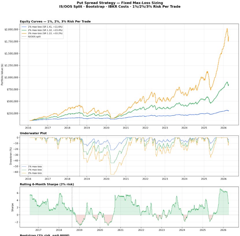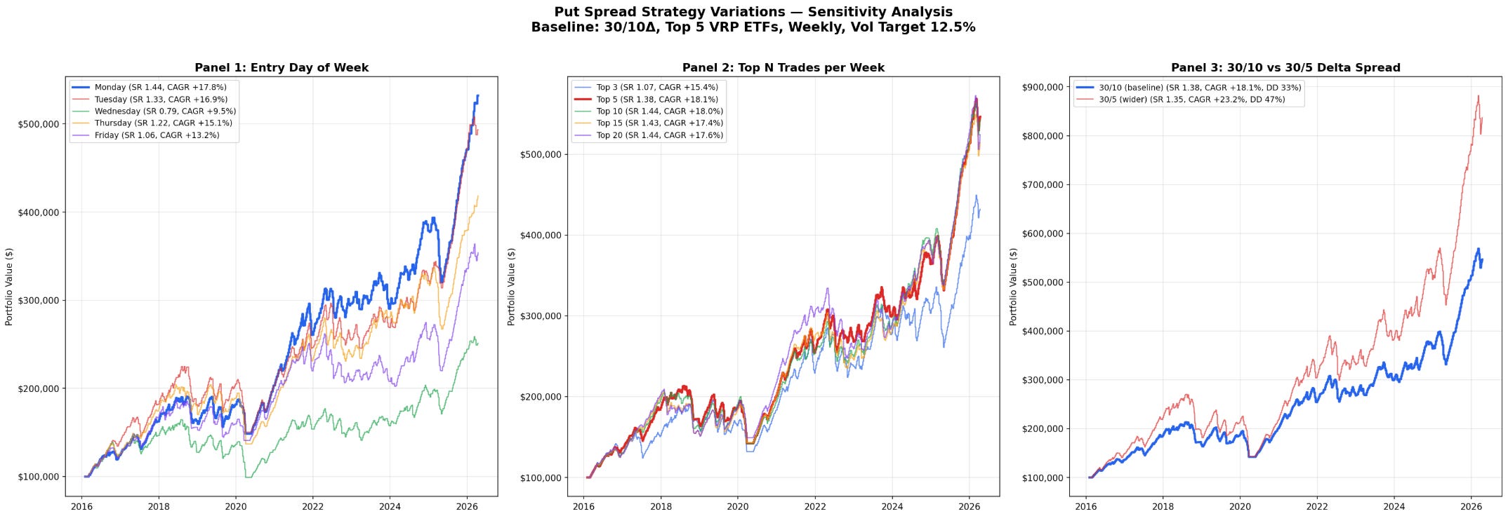 Panel 3 compares the 30/10 delta spread against a wider 30/5. The wider spread squeezes out more return at 23.2% CAGR, but the max drawdown jumps from 33% to 47%. The Sharpe barely changes, 1.38 versus 1.35. You’re getting paid more but you’re taking a significantly bigger hit when things go wrong. Its honestly up to you here if you are willing to try to get higher returns (as 5 delta options are much cheaper) or try to manage the drawdown better.