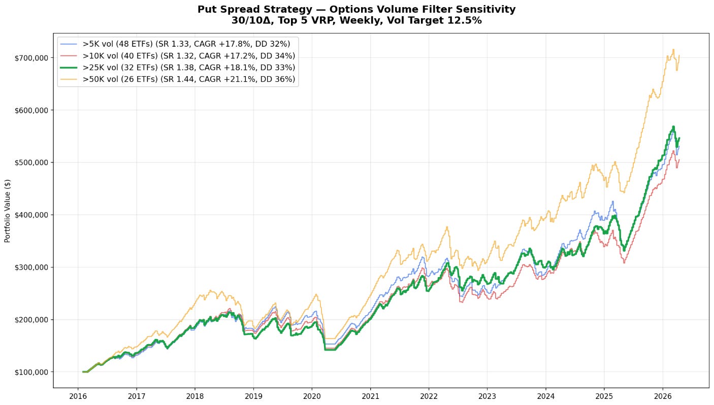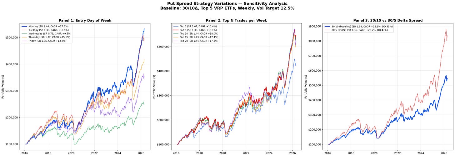 Panel 2 tests how many positions you open each week. Whether you trade the top 3, top 5, top 10, or even top 20, the Sharpe stays between 1.07 and 1.44. The CAGR ranges from 15.4% to 18.1%. More positions give you slightly more return but the risk-adjusted performance barely moves. Top 5 looks like a sweet spot where you are taking the trades with generally high VRP rather than trying to trade everything.
