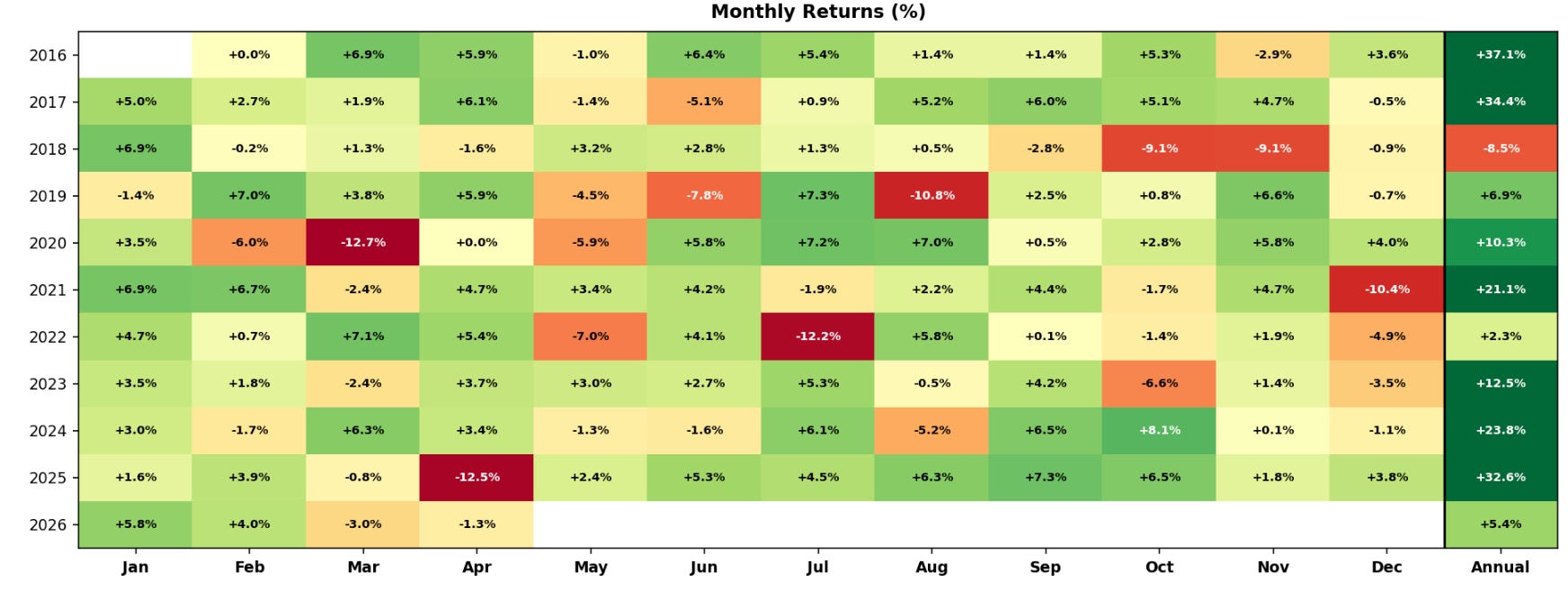 It also scales with your account. When you’re making money, positions grow. When you’re losing, they shrink automatically. Built-in compounding on the way up, built-in de-risking on the way down.