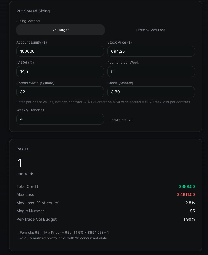 For each trade, you calculate how many contracts to sell so that the position’s expected daily P&L swing matches your risk budget. Volatile markets get fewer contracts because each one moves more. Calm ones get more contracts because each one barely moves. Every position ends up contributing roughly the same dollar risk to the portfolio.