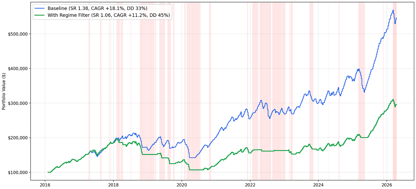 I actually spent some time building a regime filter for the broad market and applied those findings to the backtest to see if avoiding trades when things get shaky does any good. It turned out it doesn't.