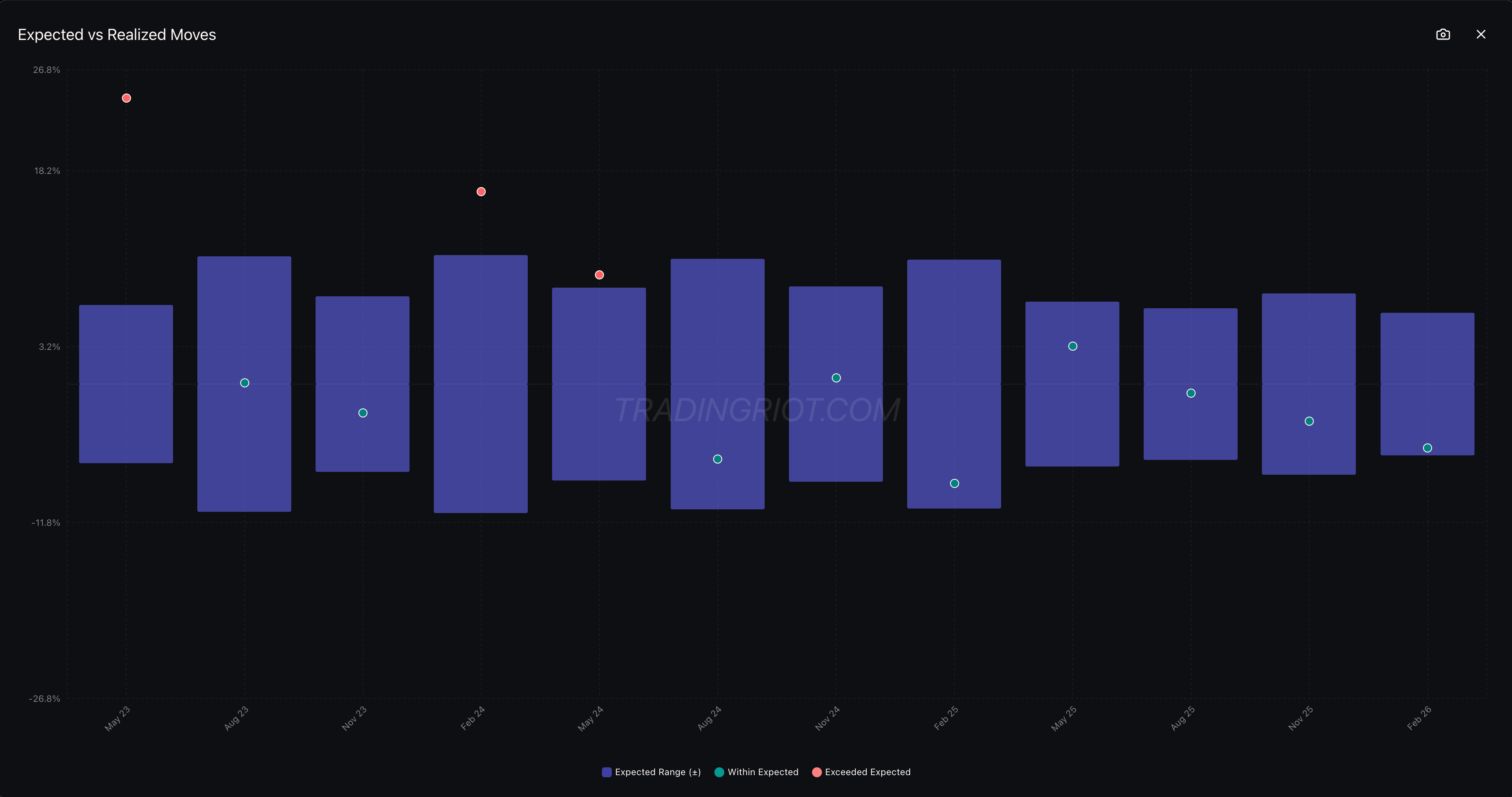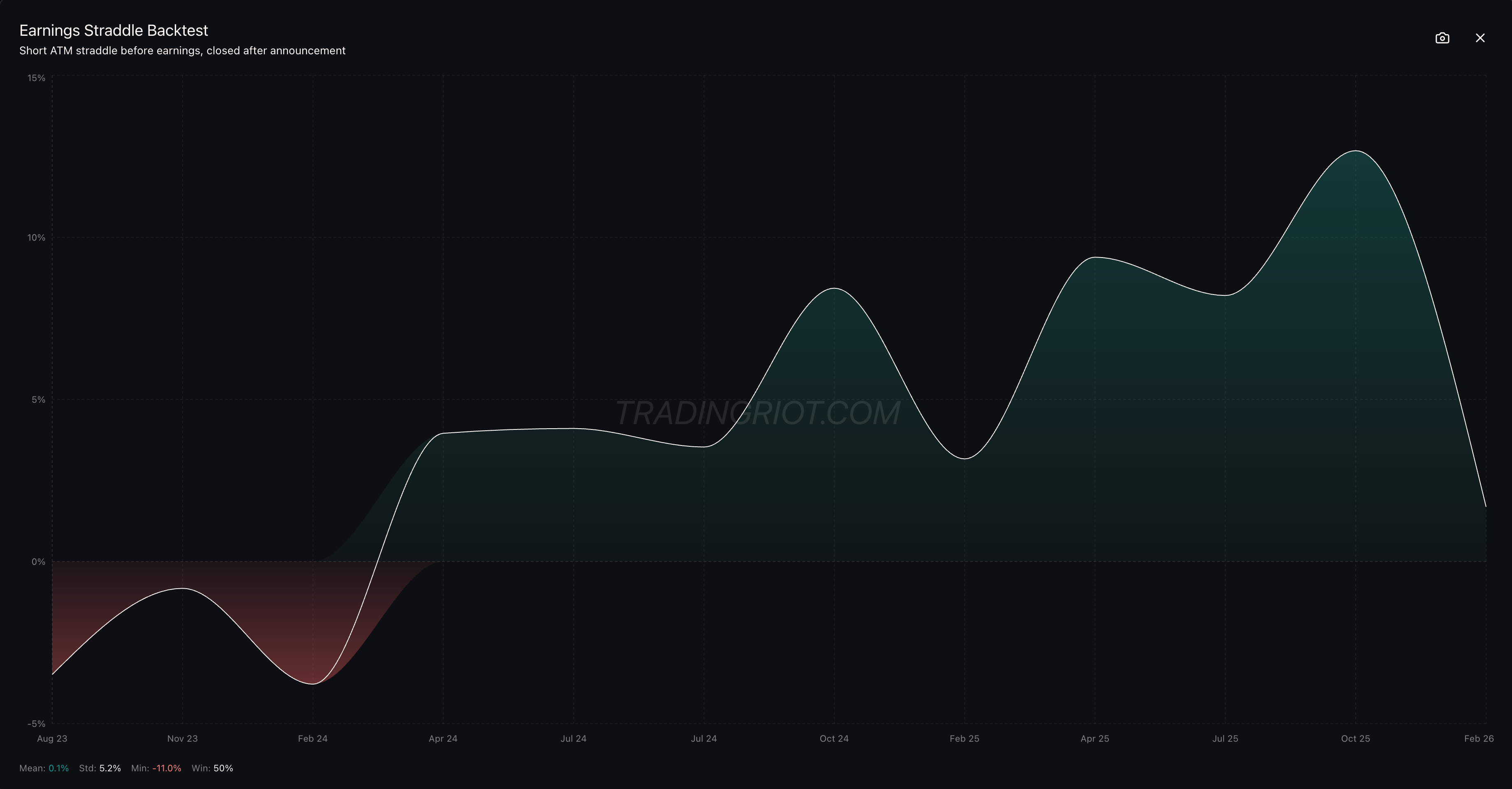 When historical data shows that a stock has consistently overpriced its implied move across multiple quarters, the short pre-earnings straddle can even be held through the announcement itself. You’re combining the pre-event premium capture with the post-event vol crush on a name where the market systematically overestimates earnings risk. This is higher risk, but also brings the additional benefit of post-earnings IV-crush.