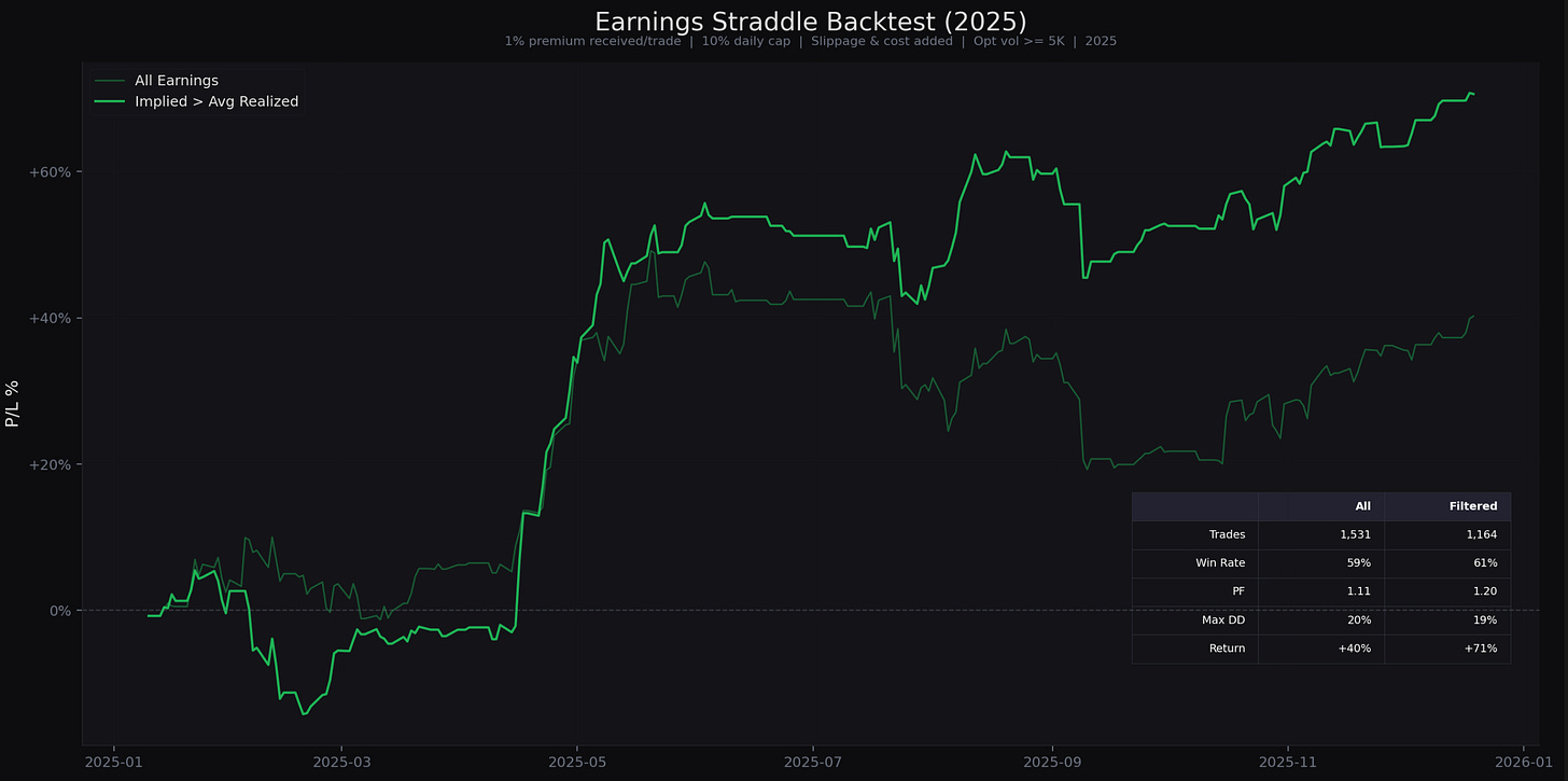 As you can see in the backtest below, trading only stocks where the implied move is larger than the historical average realized move produced better returns with fewer trades.