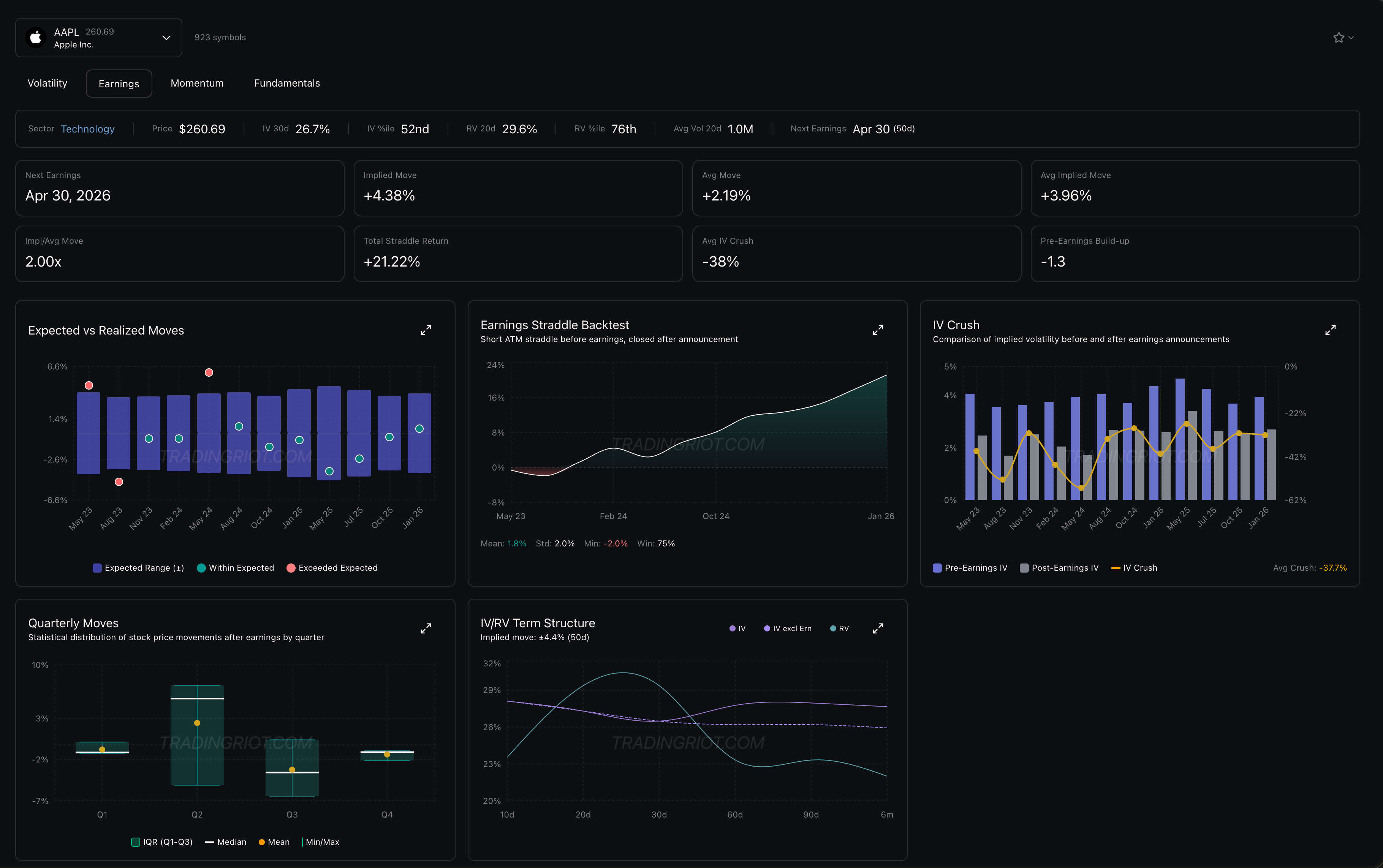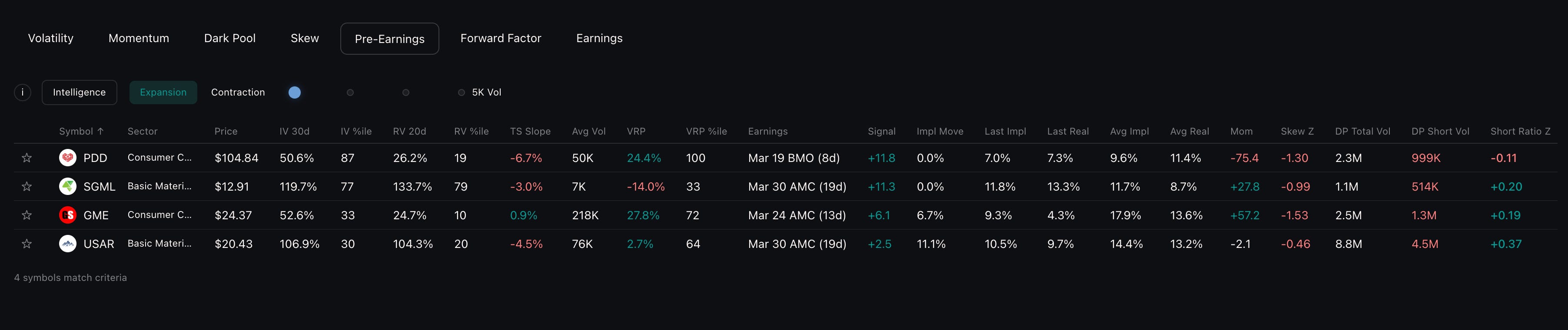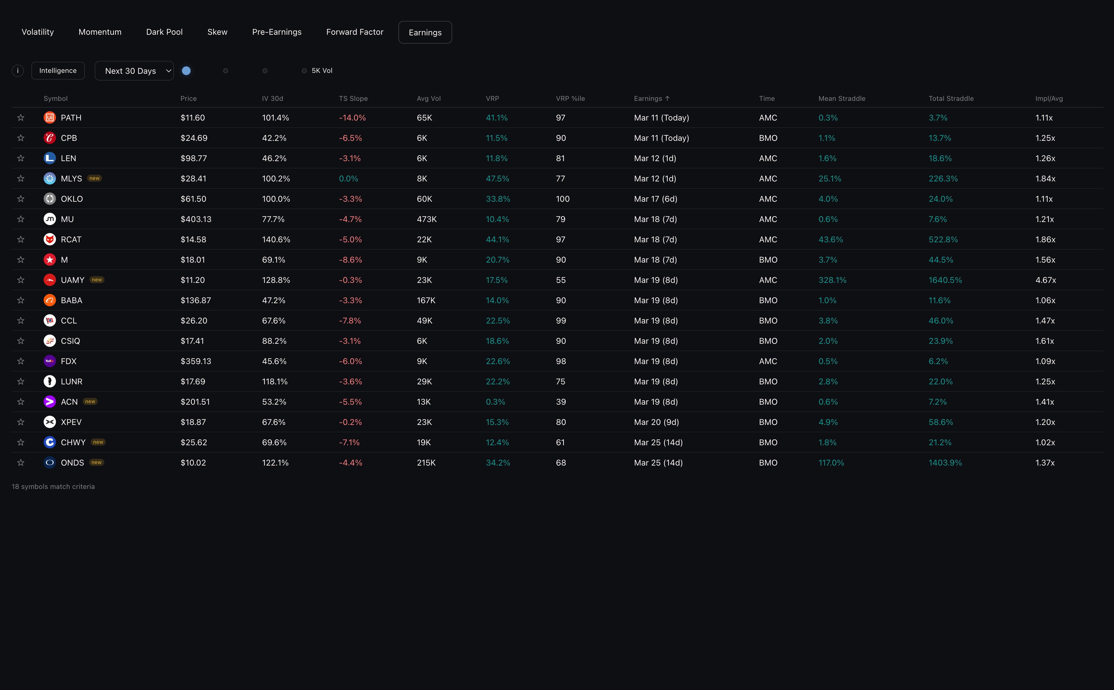 The data analysis behind our Pre-Earnings screener examined this systematically. The key predictors of pre-earnings straddle returns all center on one question: how does the current implied move compare to historical benchmarks?