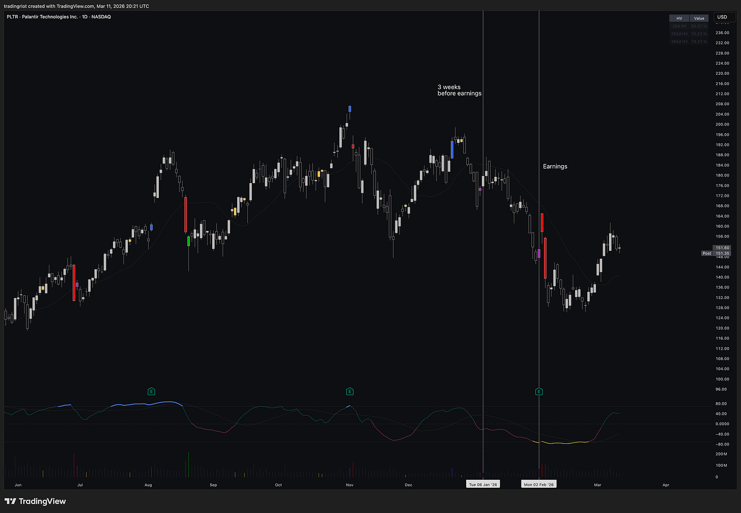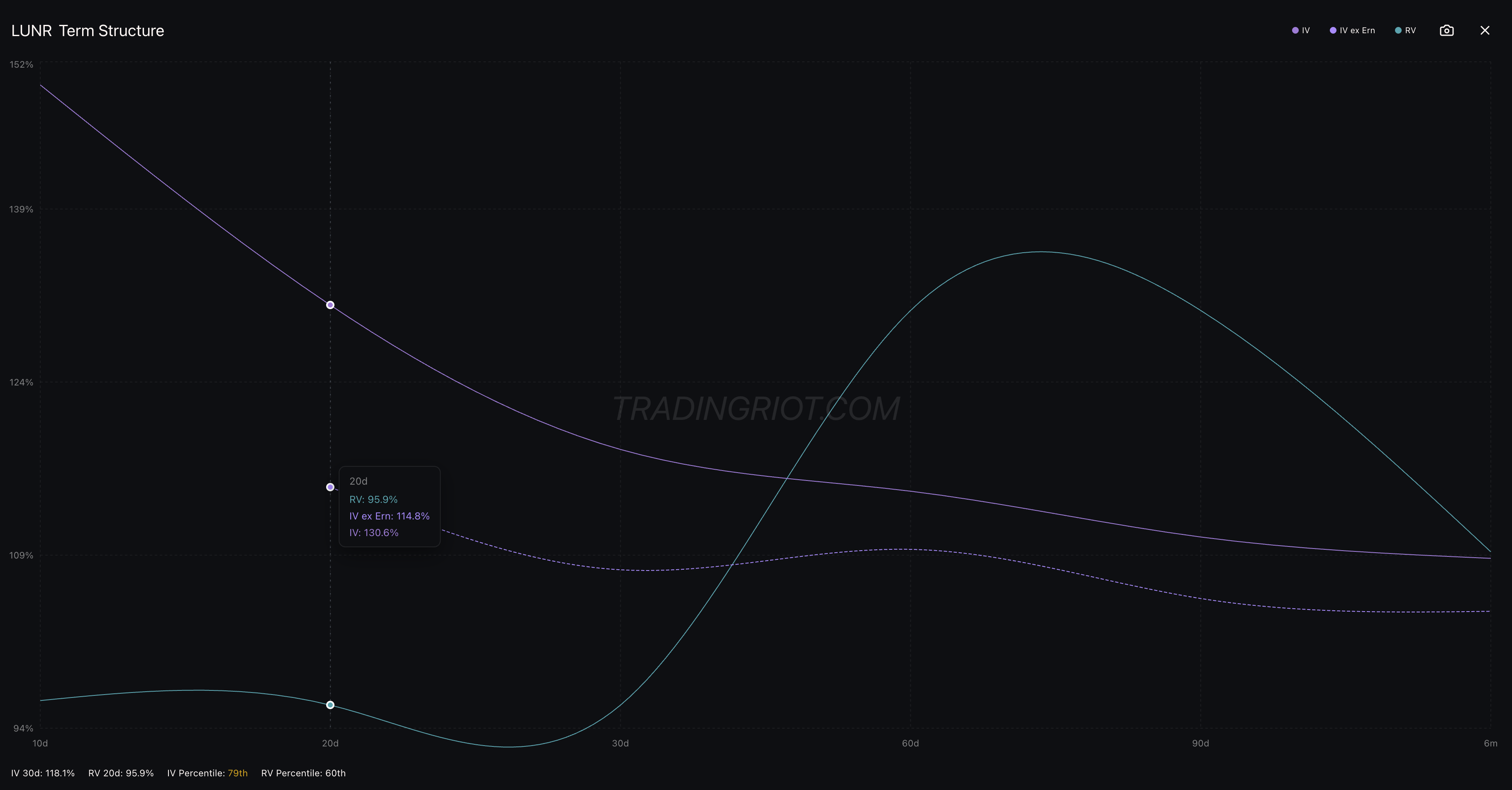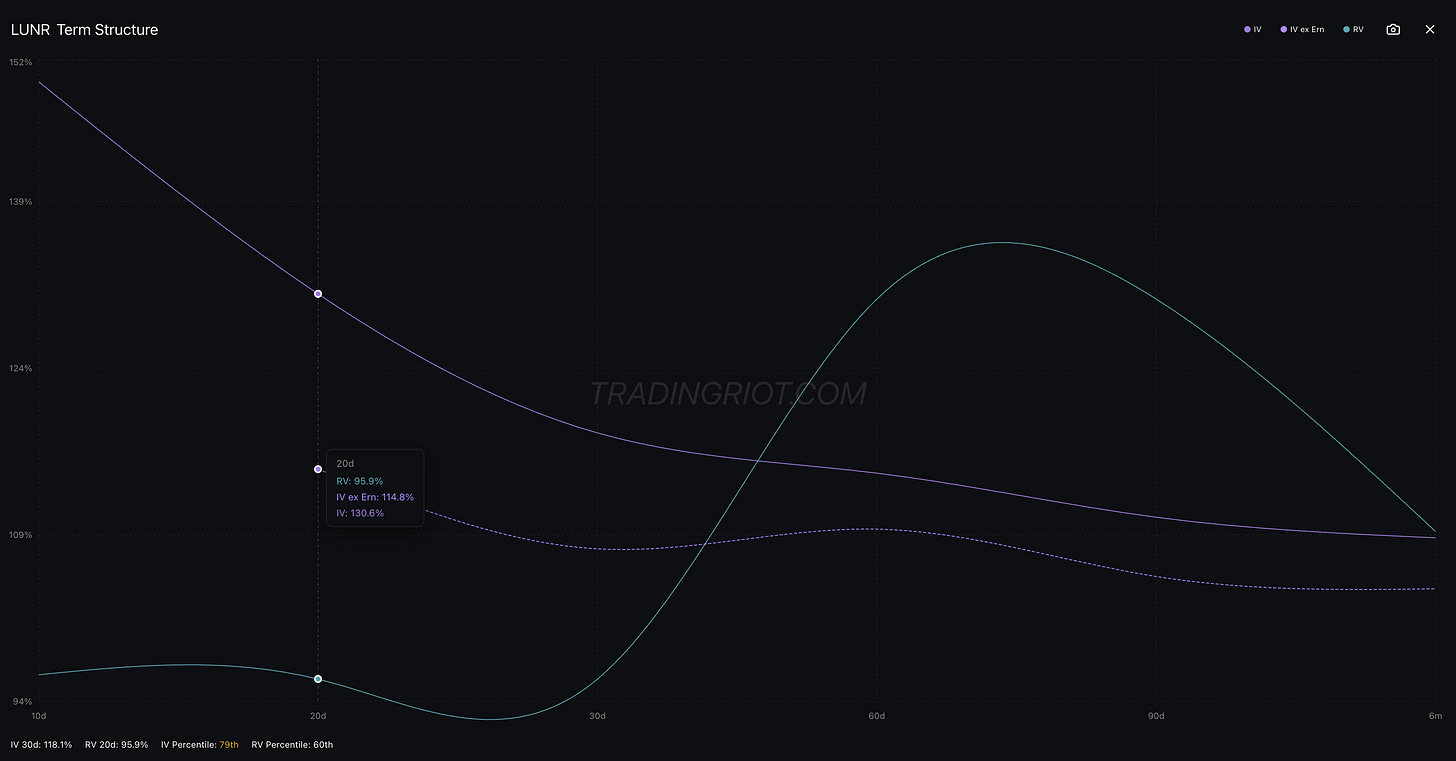 LUNR, for example, is one of the stocks with earnings coming up soon. You can see that 20-day IV, which includes the earnings event, sits at about 130%. But if we exclude earnings, IV drops to 114%. That means buying those options already carries the earnings premium baked in.
