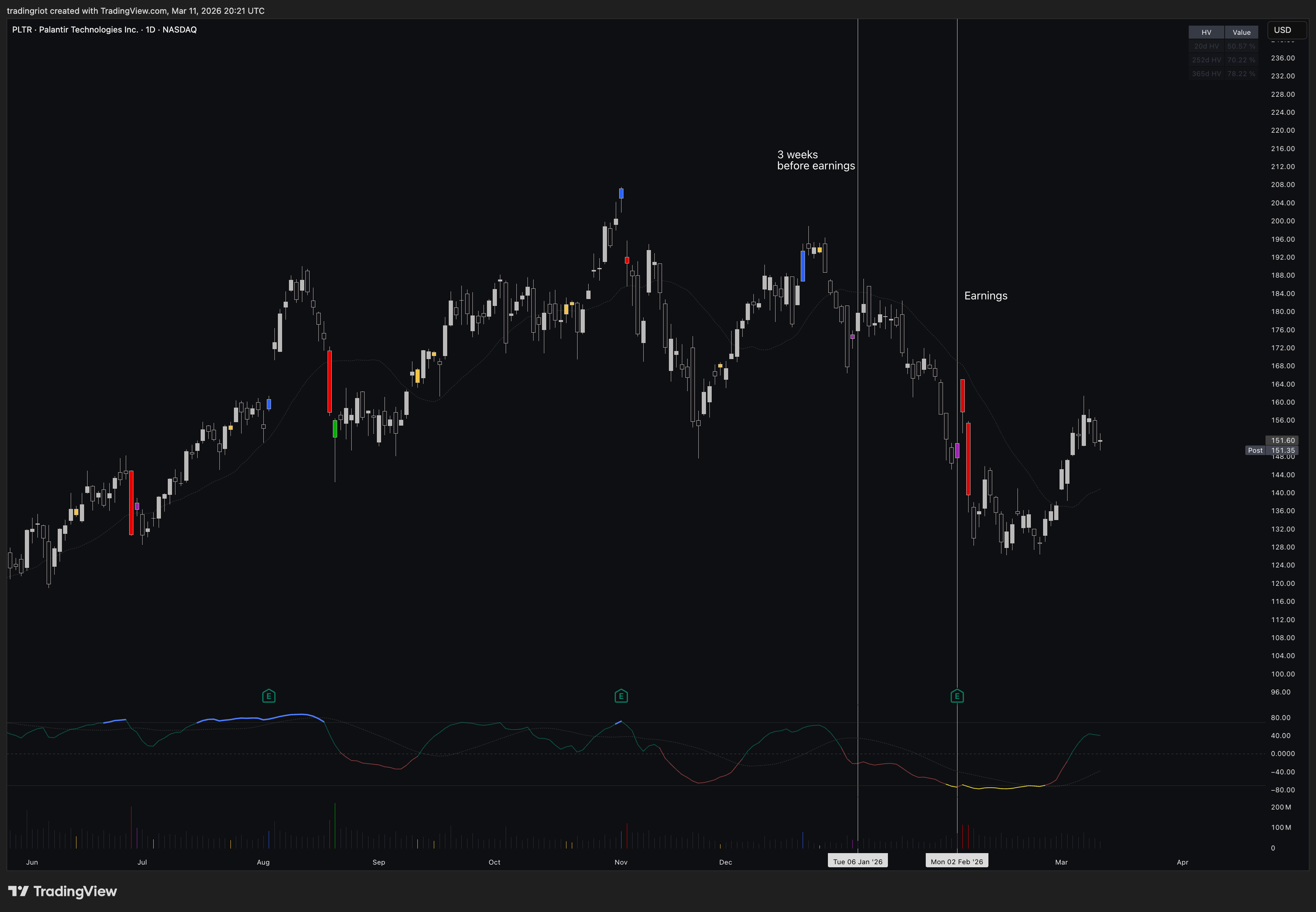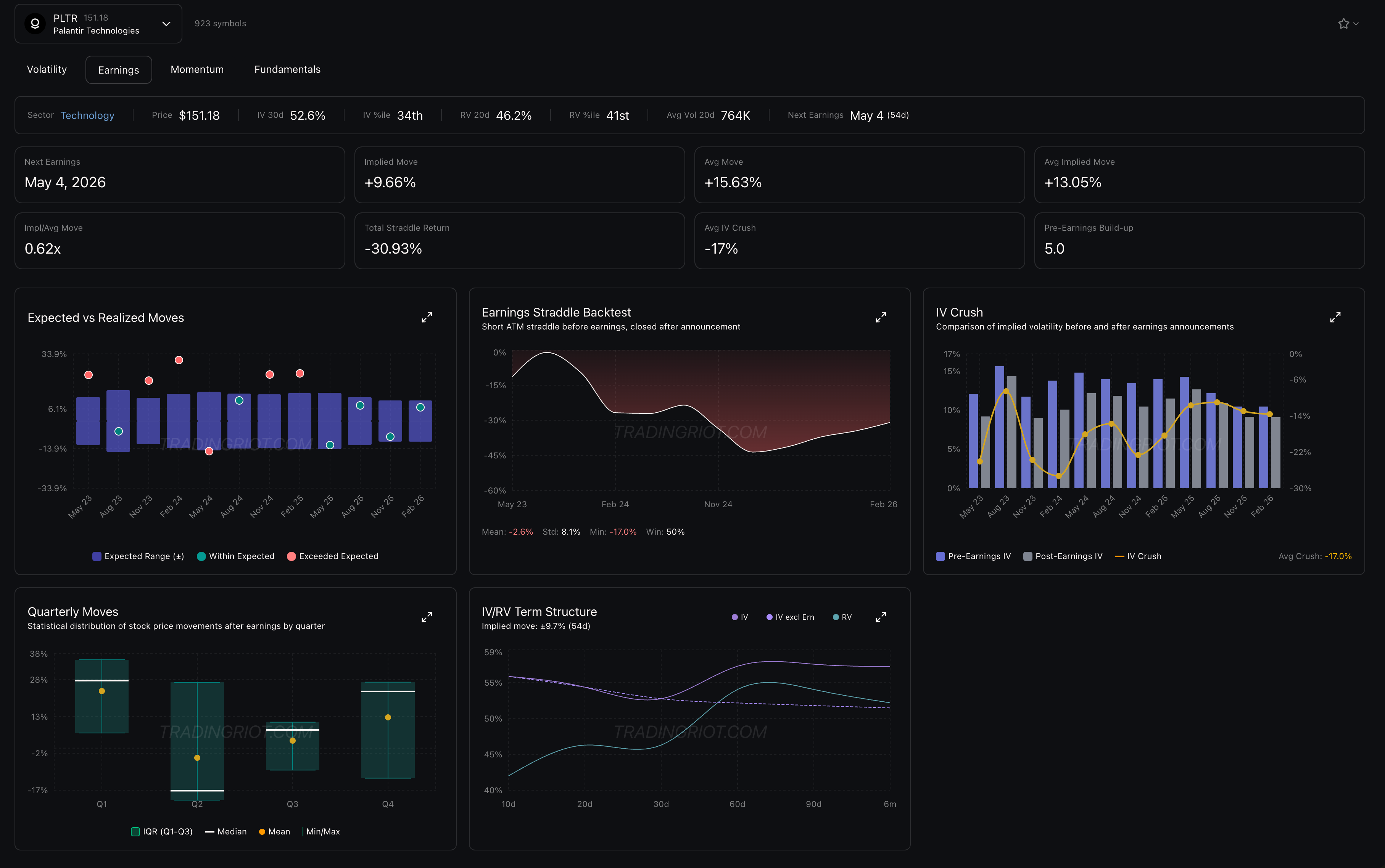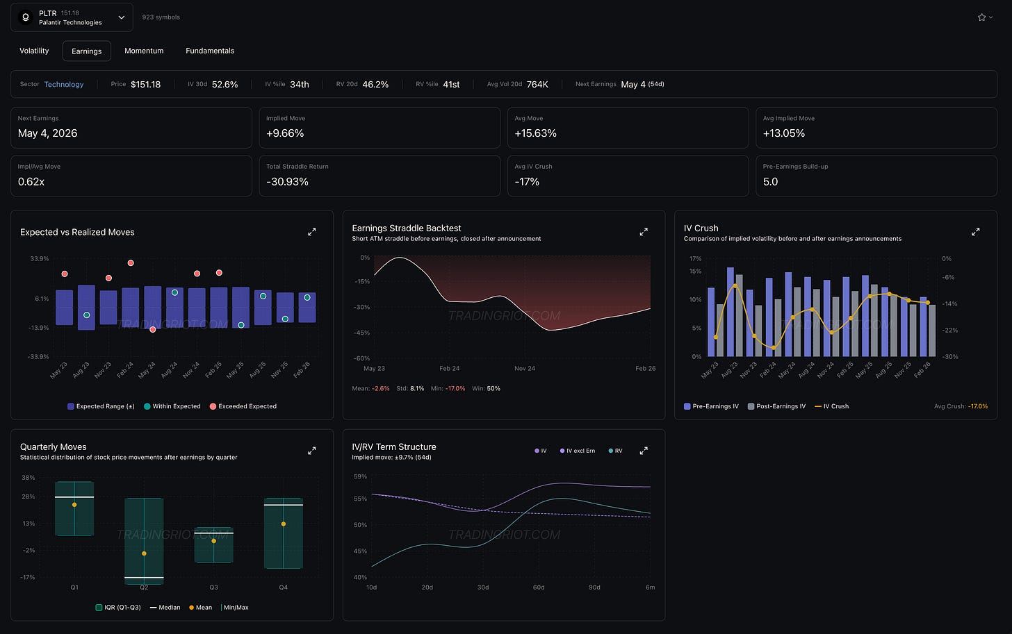 LUNR, for example, is one of the stocks with earnings coming up soon. You can see that 20-day IV, which includes the earnings event, sits at about 130%. But if we exclude earnings, IV drops to 114%. That means buying those options already carries the earnings premium baked in.