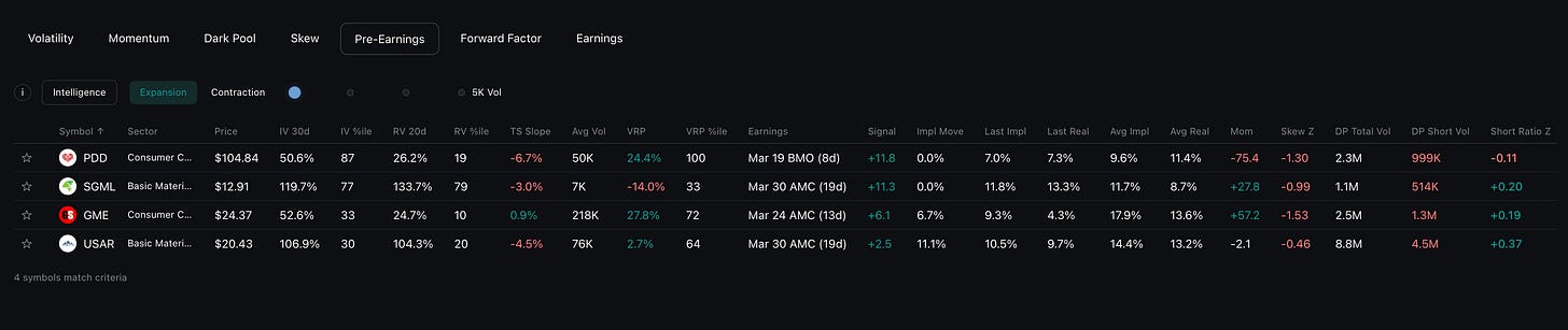 This is where VRP (Variance Risk Premium) becomes especially critical. For the short vol variant, you want IV extended well above realized volatility, giving you a cushion. For the long vol variant, you ideally want low or negative VRP, where the stock is actually moving but options haven’t caught up yet.