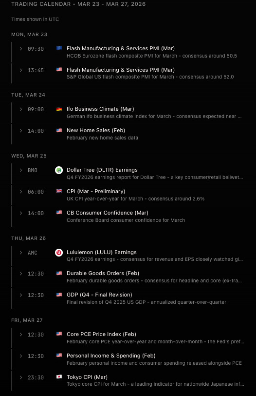 The calendar this week is packed (flash PMIs Monday, UK CPI midweek, core PCE Friday) but honestly, none of it matters as much as the next headline out of the Middle East.