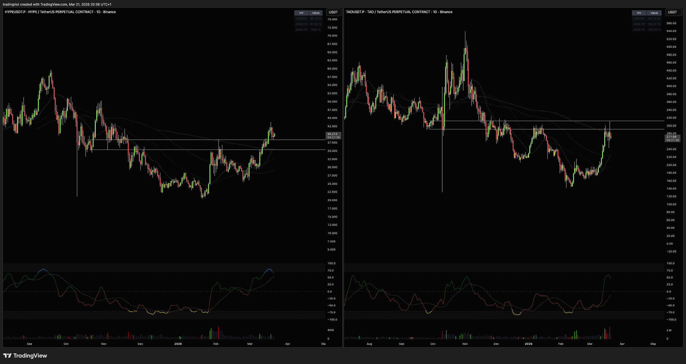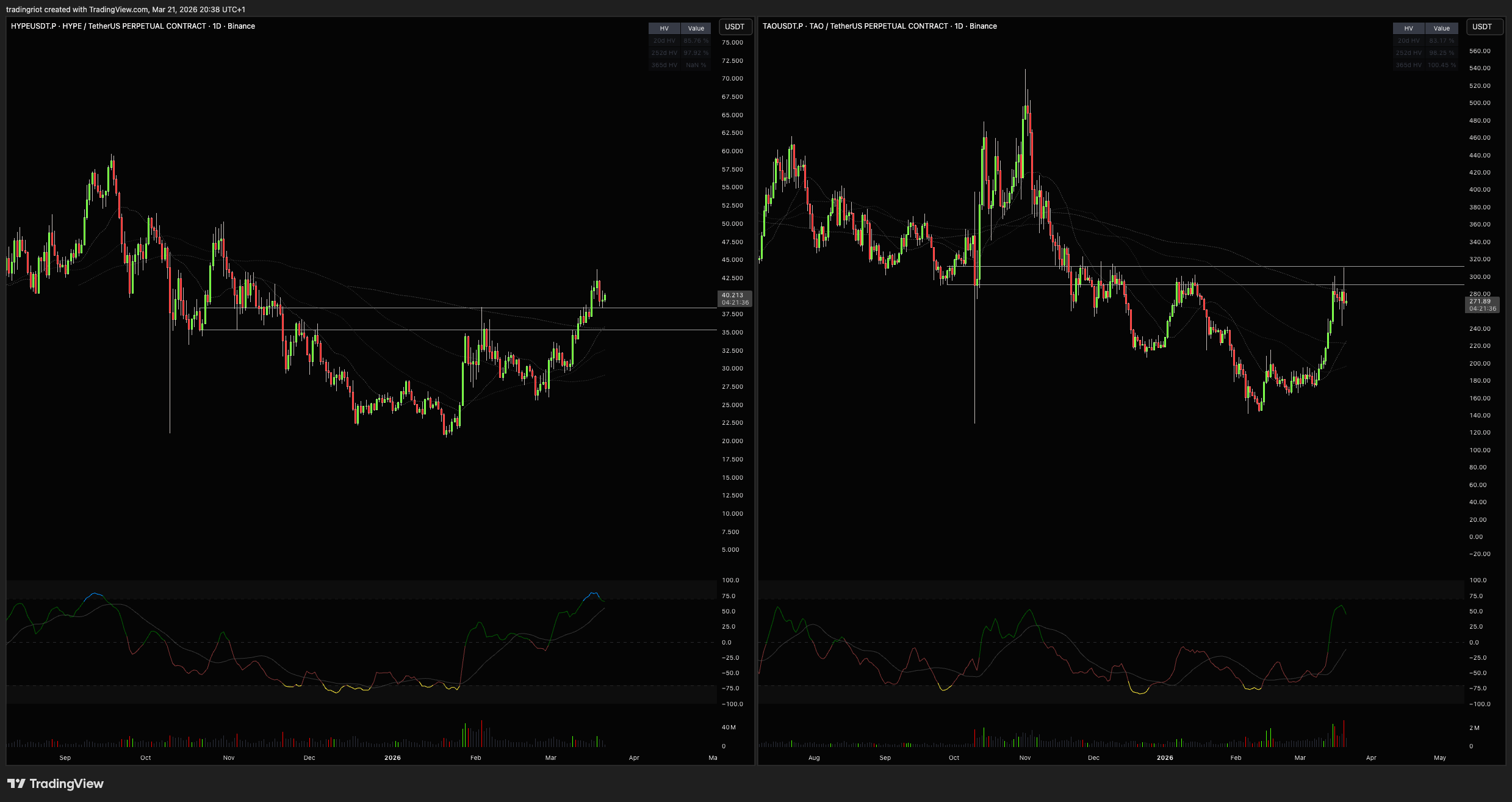 HYPE still looks solid for more upside as long as $35 holds. TAO on the other hand hit resistance and struggled on Friday, so I'd be more patient there and wait to see if it can reclaim 310-315 before placing any bids.