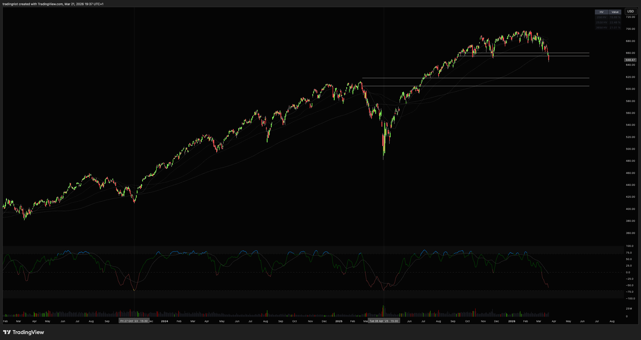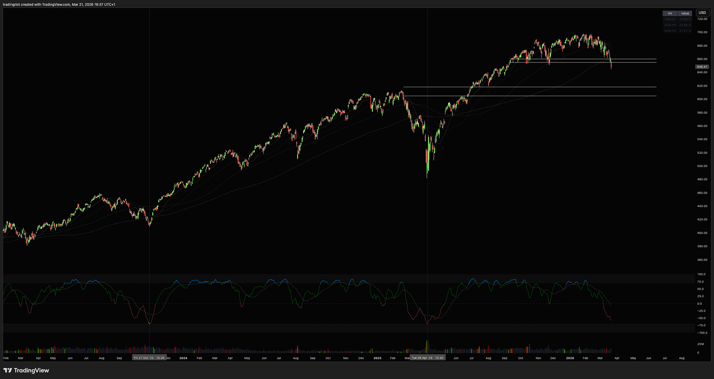 Looking at the chart, the key area where I'd be happy to dip into longs is between 620-610 as it is confluent of prior resistance area and would also hit the peak panic territory from momentum perspective. I'm also watching a possible reclaim (or fail) of the 660 level, which marks prior support and the 200 DMA.