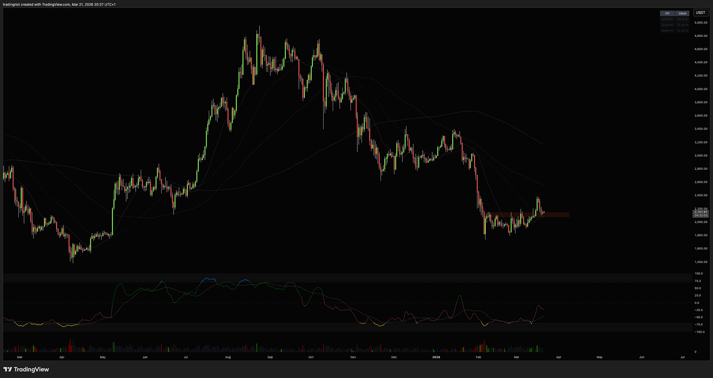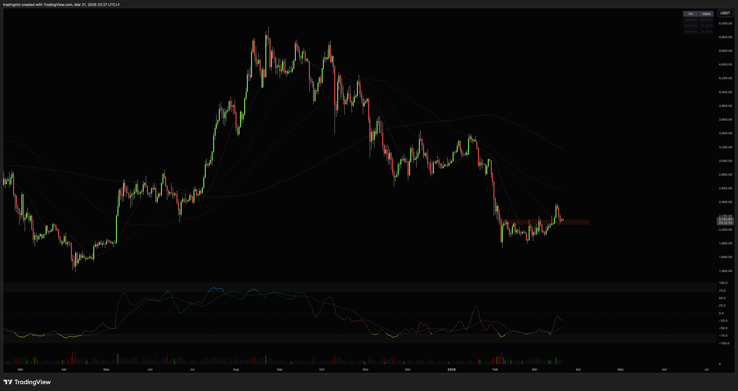 If ETH is really strong here and about to catch a bid, I don't think there's that much reason to go lower. A fakeout under current support is acceptable, but it should get quickly bid up if the buy interest is really there. Losing the 2100 level will most likely just continue the ETH curse and roll over to test yearly lows again.