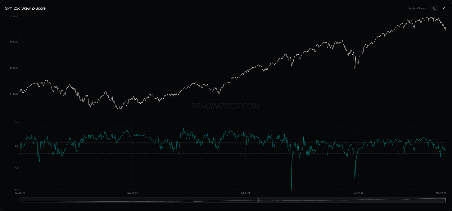 One thing I mentioned last week that hasn't changed is put skew. The fact that it's not getting more elevated is interesting. Expensive puts during market stress are almost the signature for any equity index with negative spot-vol correlation. This time around, put skew is far from extreme.