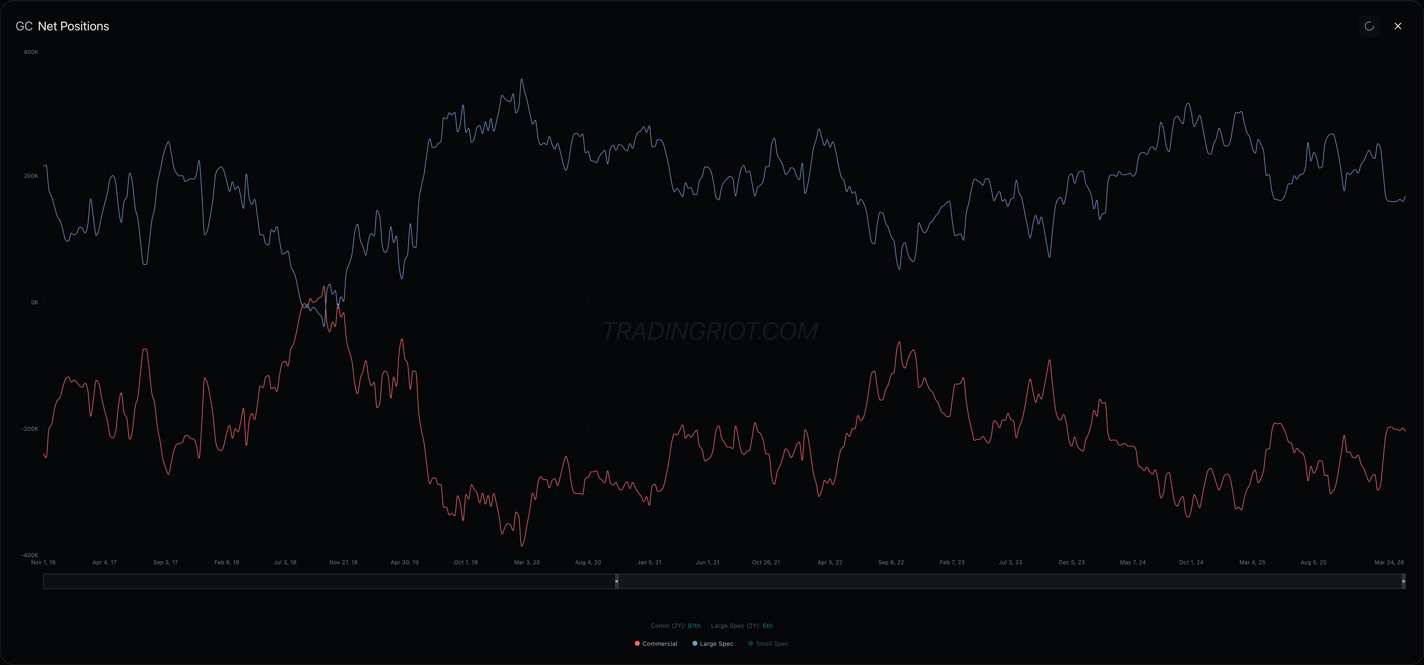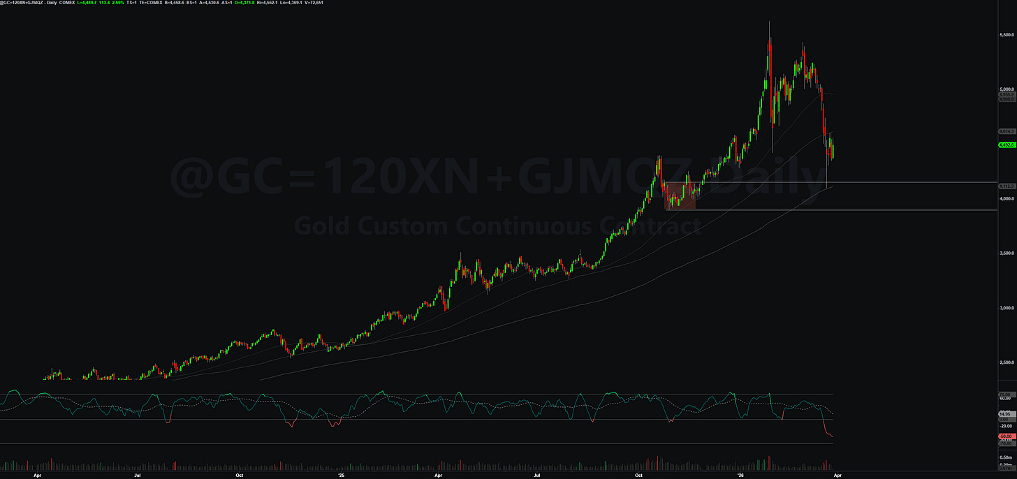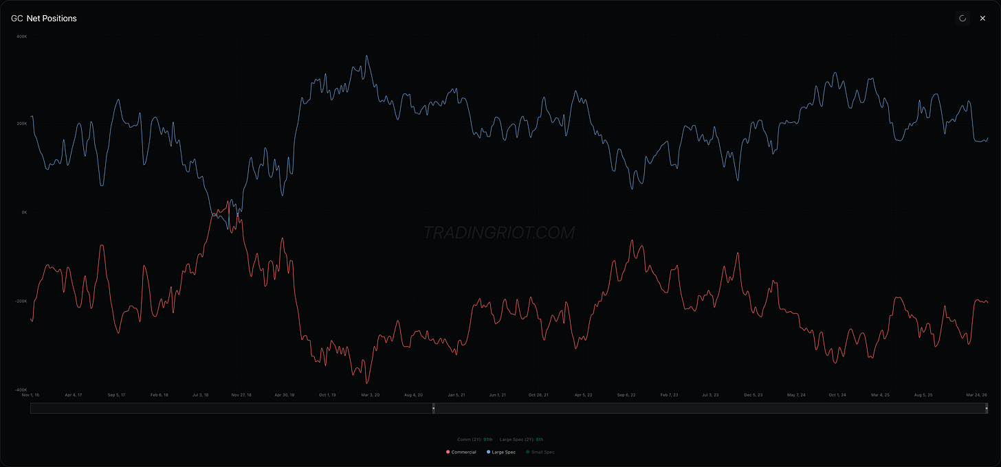 The current global situation also favors gold with Central bank buying remains at record levels and geopolitical risk is the highest it's been in decades. After the wild swings we saw lately, some consolidation skewed to the upside makes sense here, especially with heavy put skew and large speculators sitting on the short side.