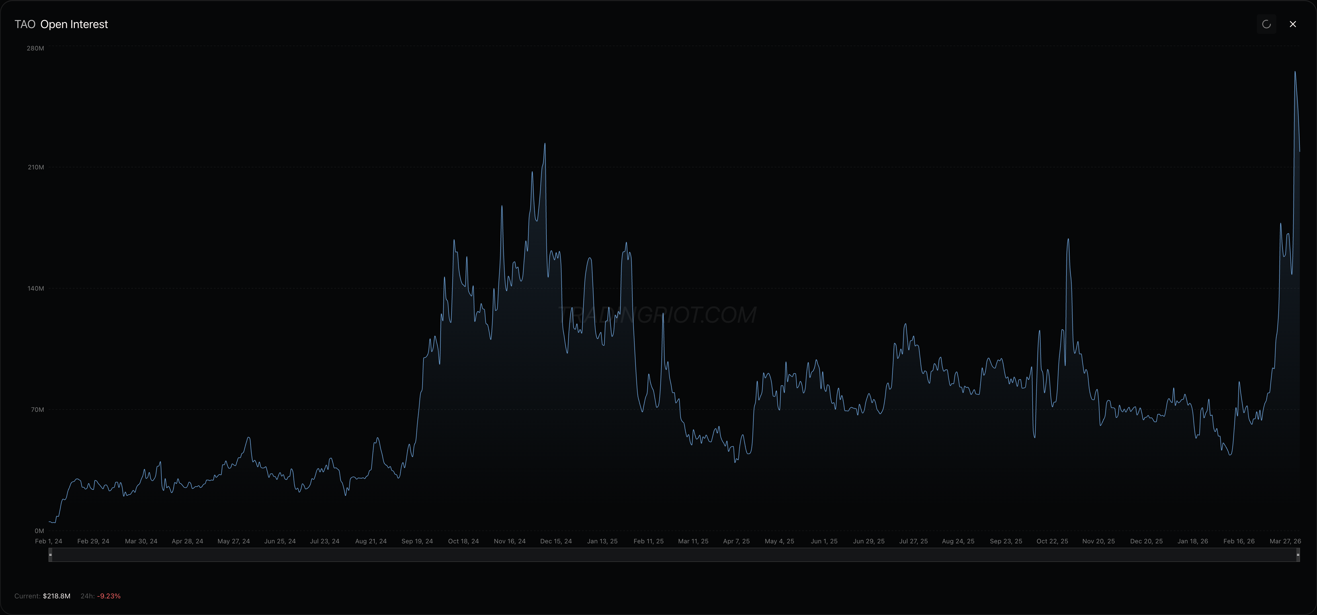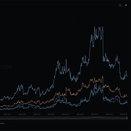 Not a whole lot happened in crypto this week besides TAO, which continued its rally. TAO remains alongside HYPE as the two best-performing assets. TAO is the main driver on the AI front, while HYPE benefits from growing interest in tradfi perps trading on-chain. Both pulled back slightly towards the end of the week but still remain in what I’d consider an uptrend. One thing to note is that TAO hit an all-time high in open interest this week, so it’s quickly becoming a crowded trade. I probably wouldn’t chase it heavily here.