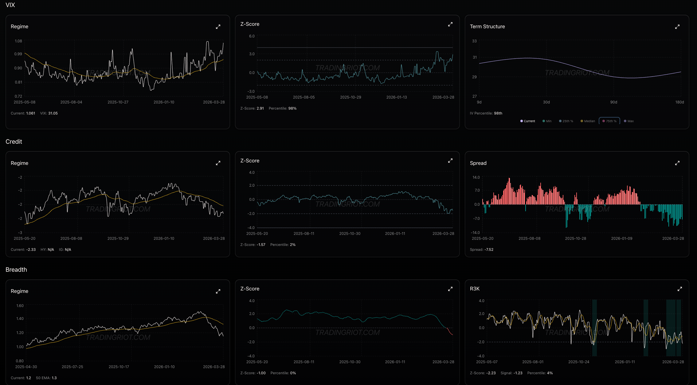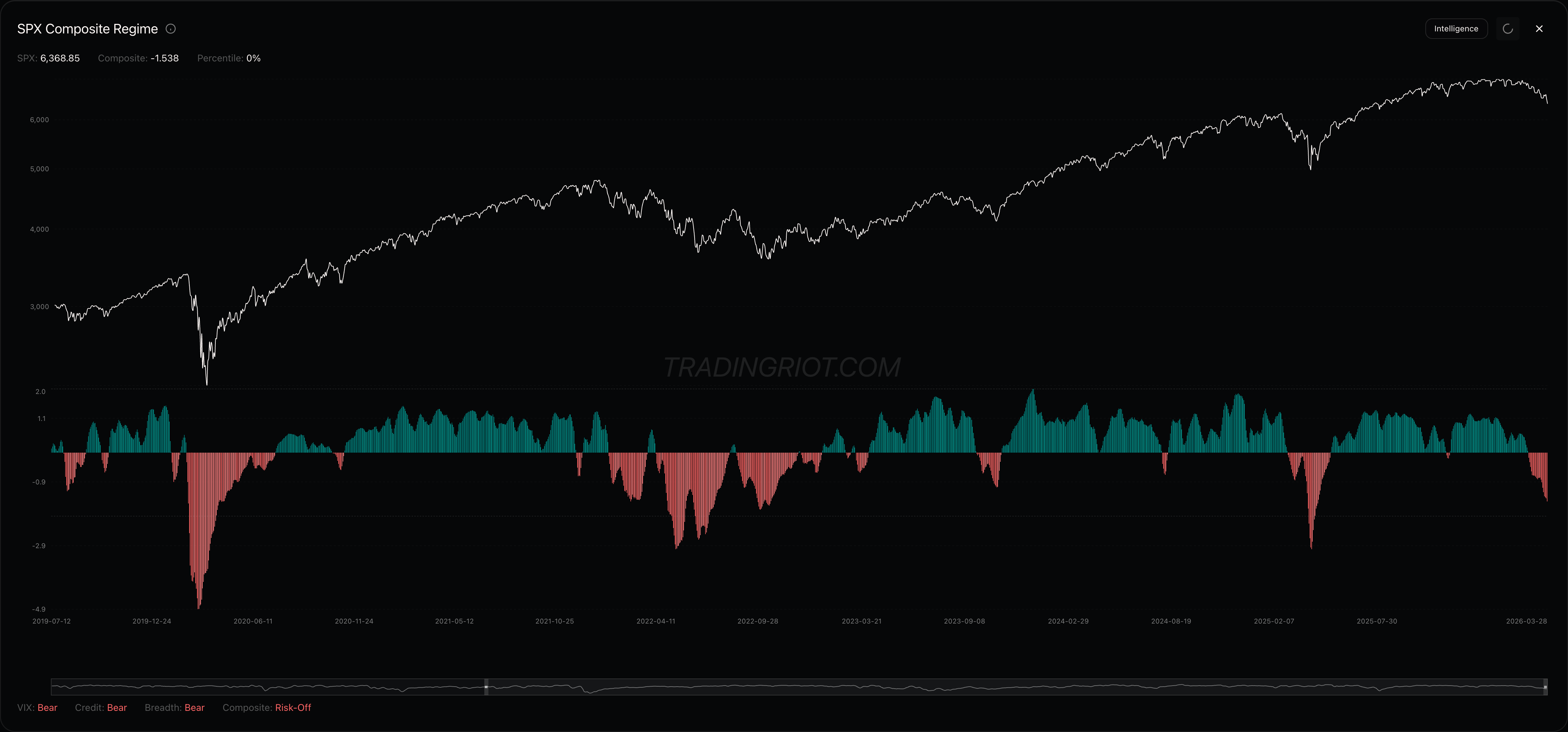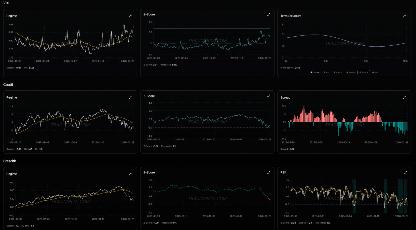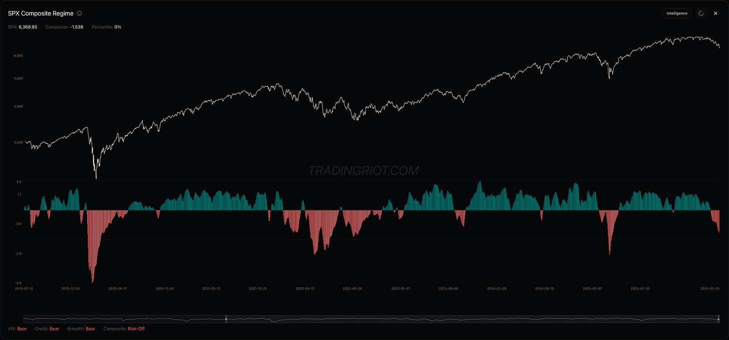 SPX Composite regime stays heavily in red, while some of these dips got bought up quickly in the past, this time that doesn’t seem to be the case. What makes me think we might still be heading lower is that while the market keeps grinding down, we haven’t seen any of that signature elevator-down price action. VIX, credit spreads, and breadth are all staying in risk-off territory but are far from capitulation levels.