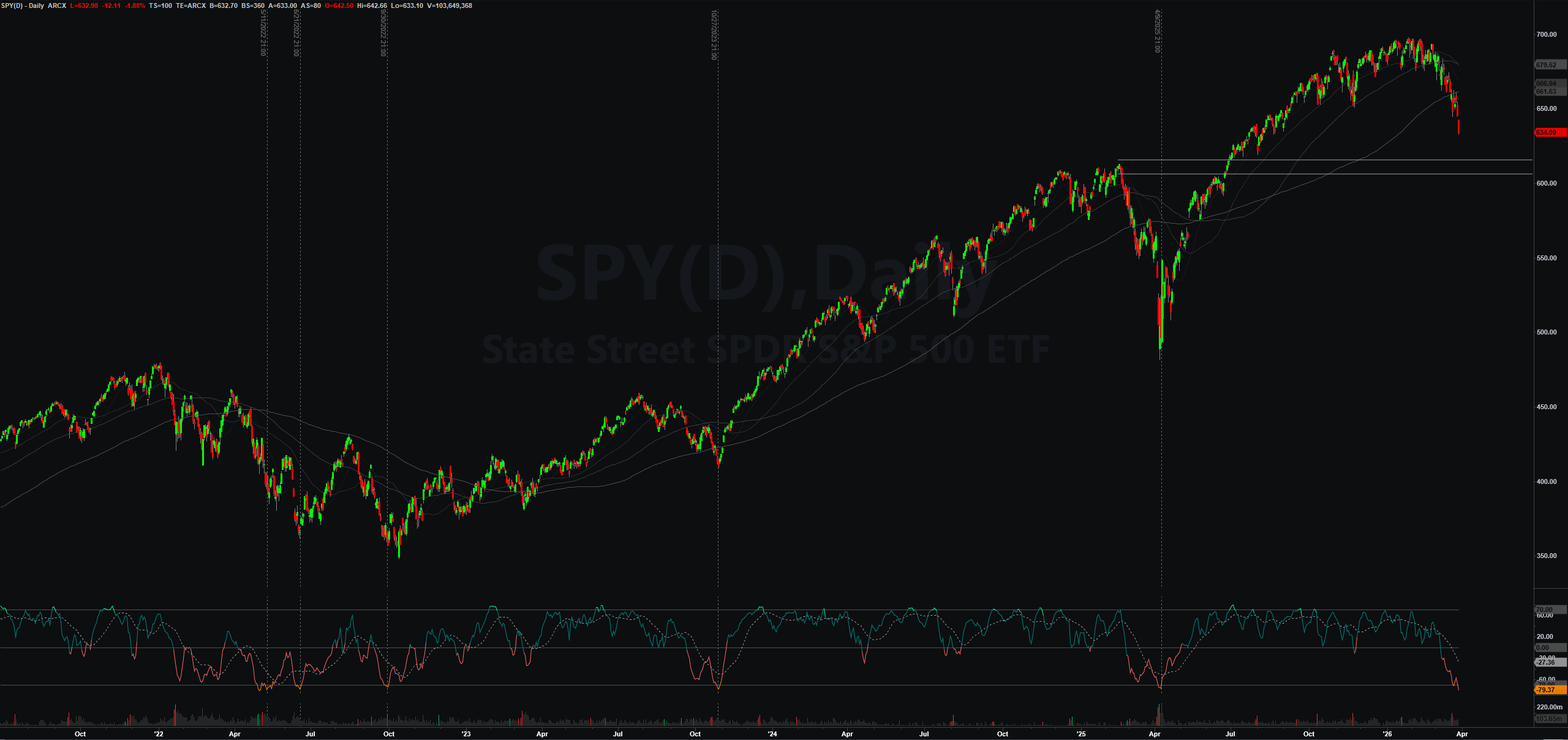Coming into next week, my main line in the sand where I'd attempt to catch a knife is between 615-605 on SPY. This lines up with the prior ATH. The momentum indicator is in strong oversold territory, but due to what I mentioned above, I don't feel like being too aggressive trying to buy this dip, especially considering the global situation.