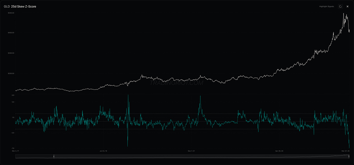 What I find interesting is gold. Besides the fact that instead of being a safe-haven calm asset, it has crazier swings than Fartcoin, put skew is the most elevated since Covid. This opens the door to several trading opportunities: selling puts, buying risk reversals if you're bullish, or structuring favorable risk-to-reward scenarios by buying a put spread if you're bearish since the elevated 10-25 delta puts will finance the ATM put.