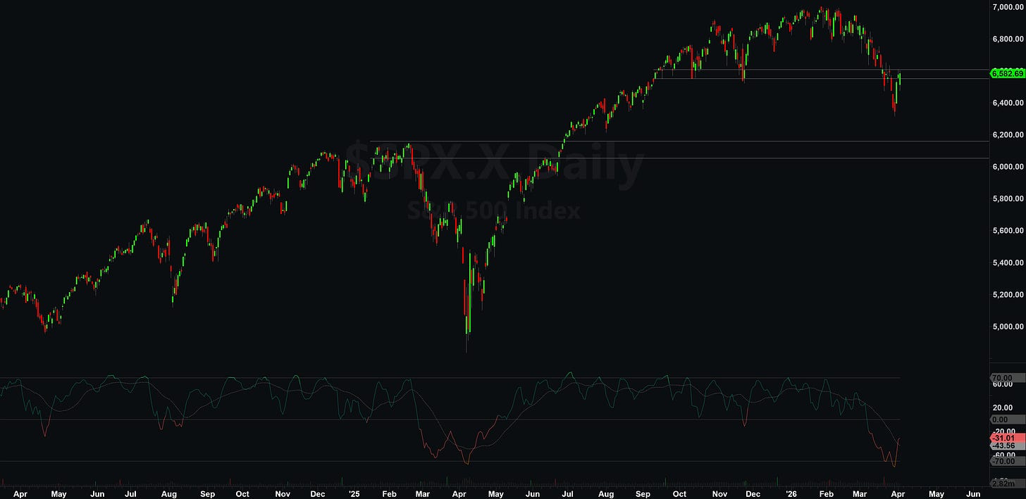 The current playbook is getting slightly boring at this point: ceasefire rumor sends everything ripping, Trump escalates, rally dies. Tuesday’s 2.9% surge on reports Iran was open to ending hostilities was the best session since May. Then Trump’s Wednesday night address promised to hit Iran “extremely hard” for weeks. The S&P round-tripped 250 points in 48 hours.