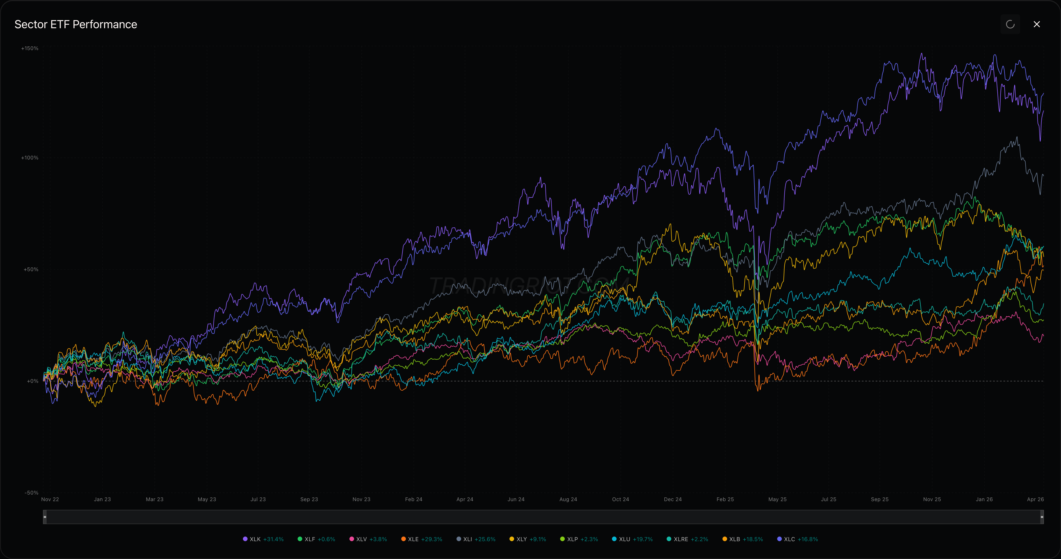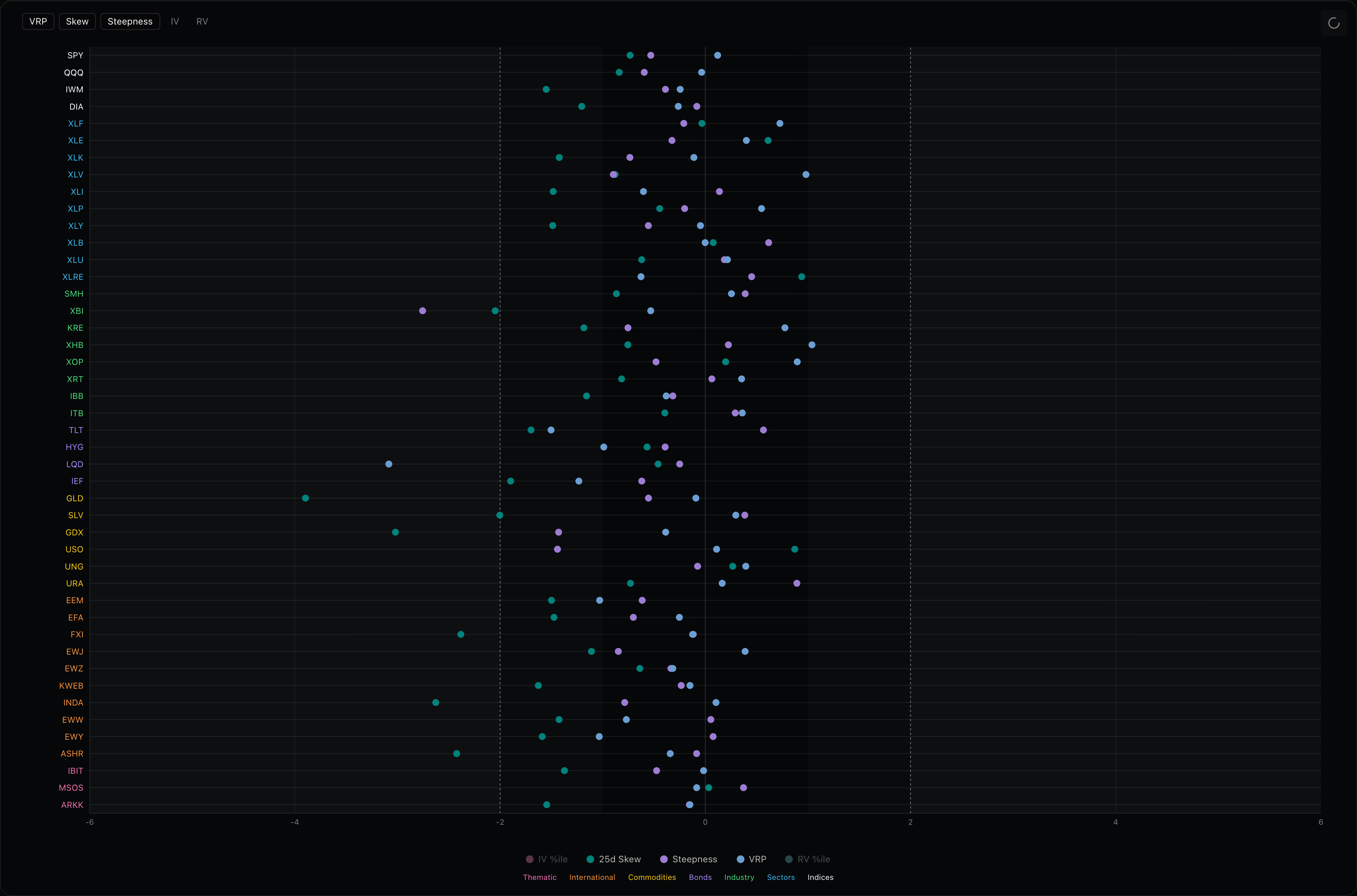 Don’t let the headline number fool you. Every single sector outside energy carries a negative one-month return. The bounce was narrow. Tech (XLK +3.3%), financials (XLF +3.6%), and consumer discretionary (XLY +2.4%) all participated, but the defensive bid underneath is still intact: XLP was basically flat on the week with 17.6% IV, the lowest of any sector by a wide margin.