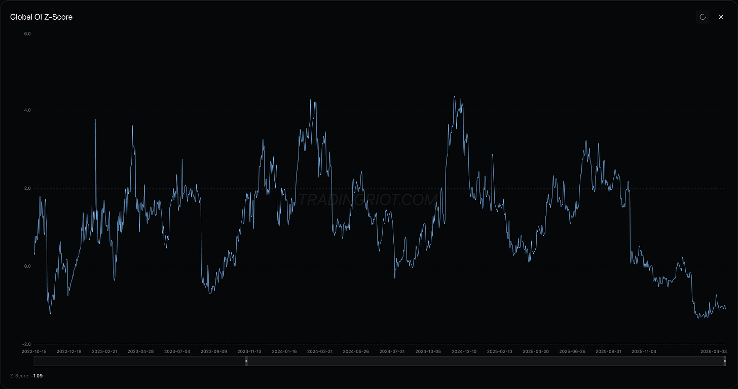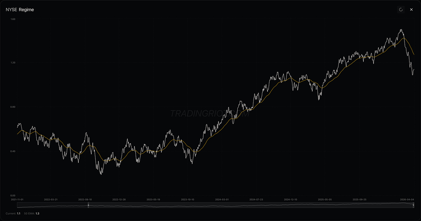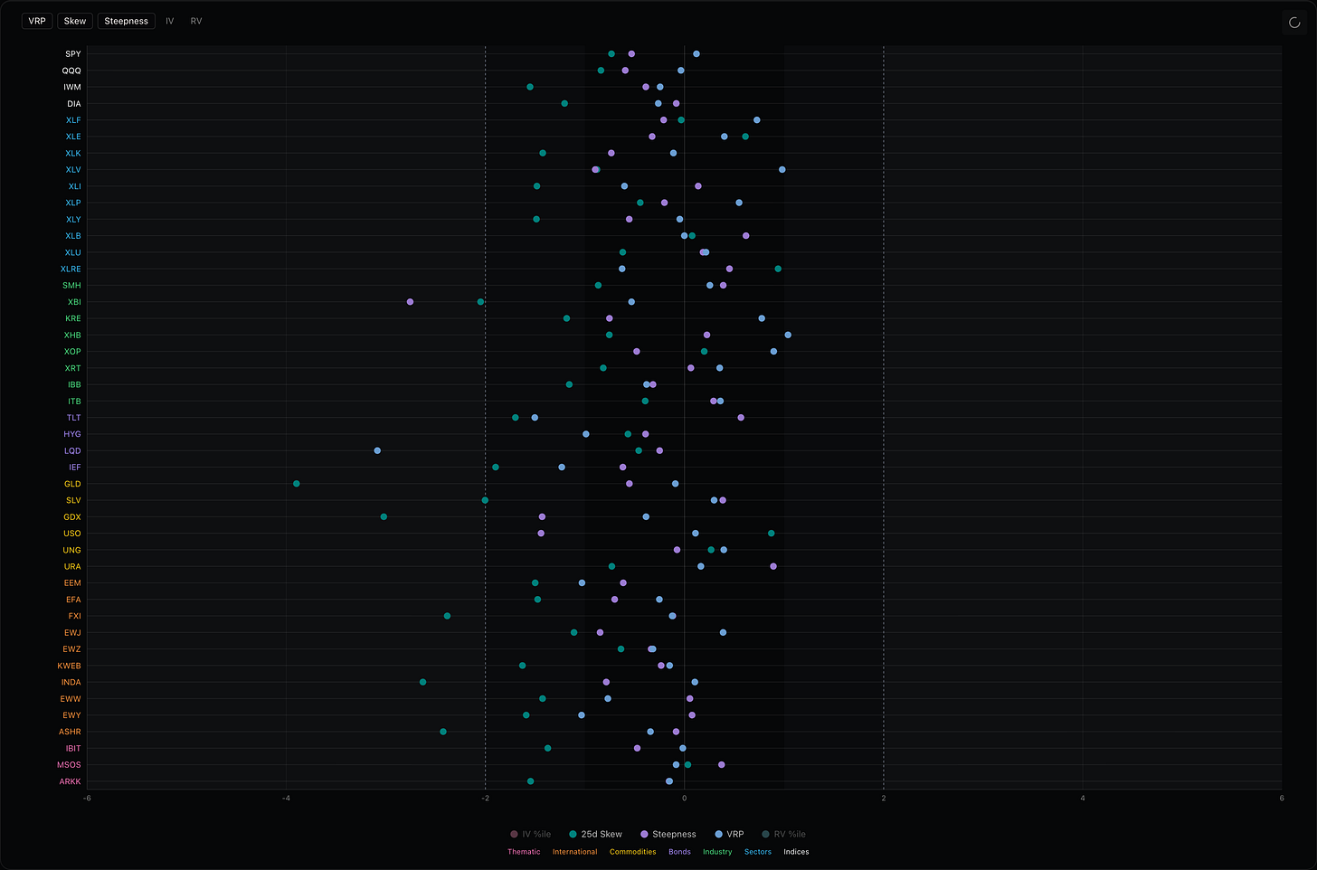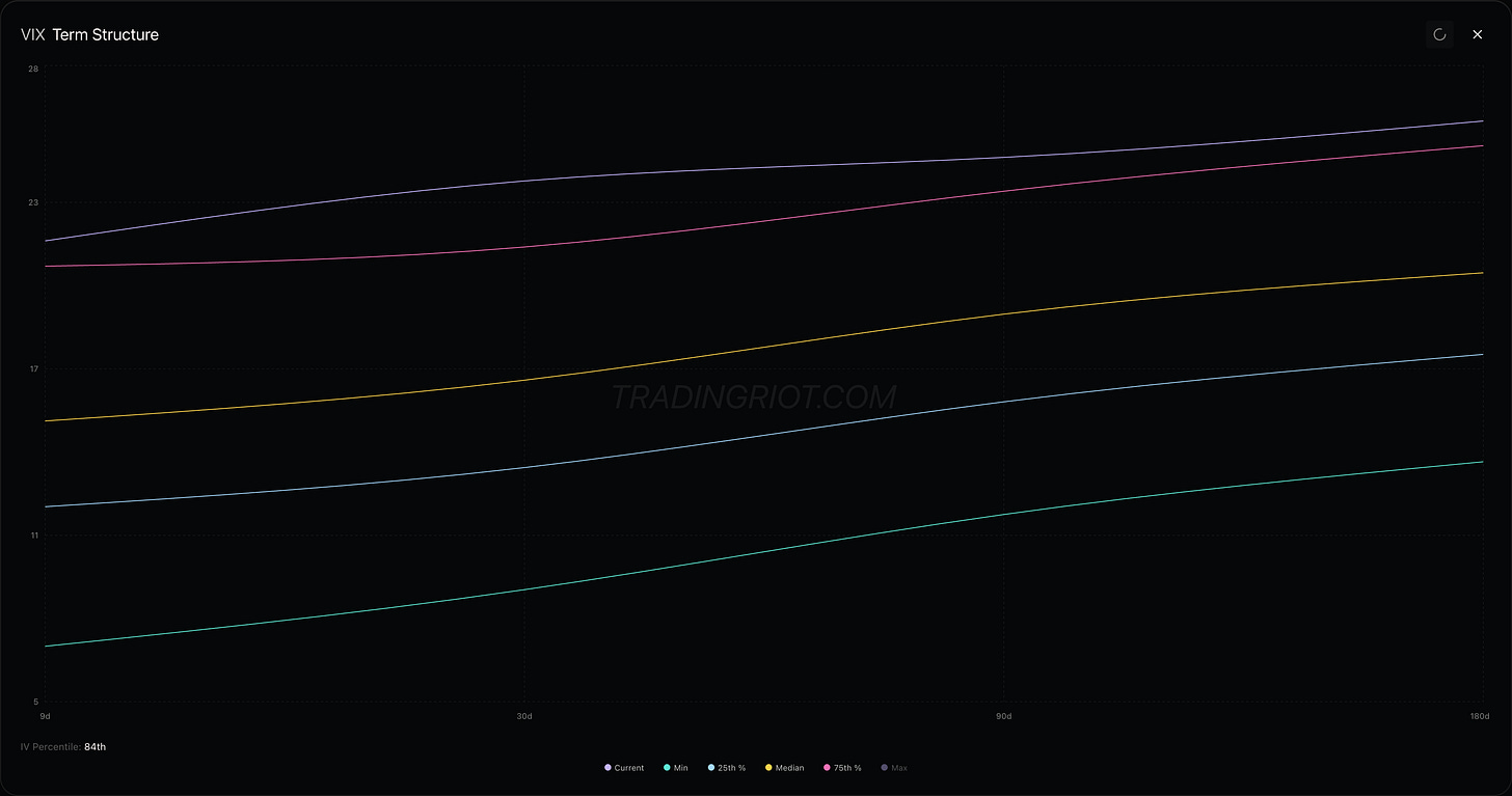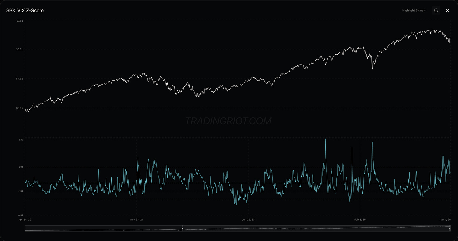 The overall VIX z-score is still elevated, hovering around 2. This is a very hard environment to trade VIX, as the market is missing that classic elevator-down move. Instead, VIX is just having a huge back and forth intra-week.