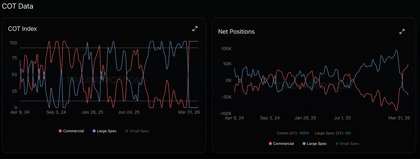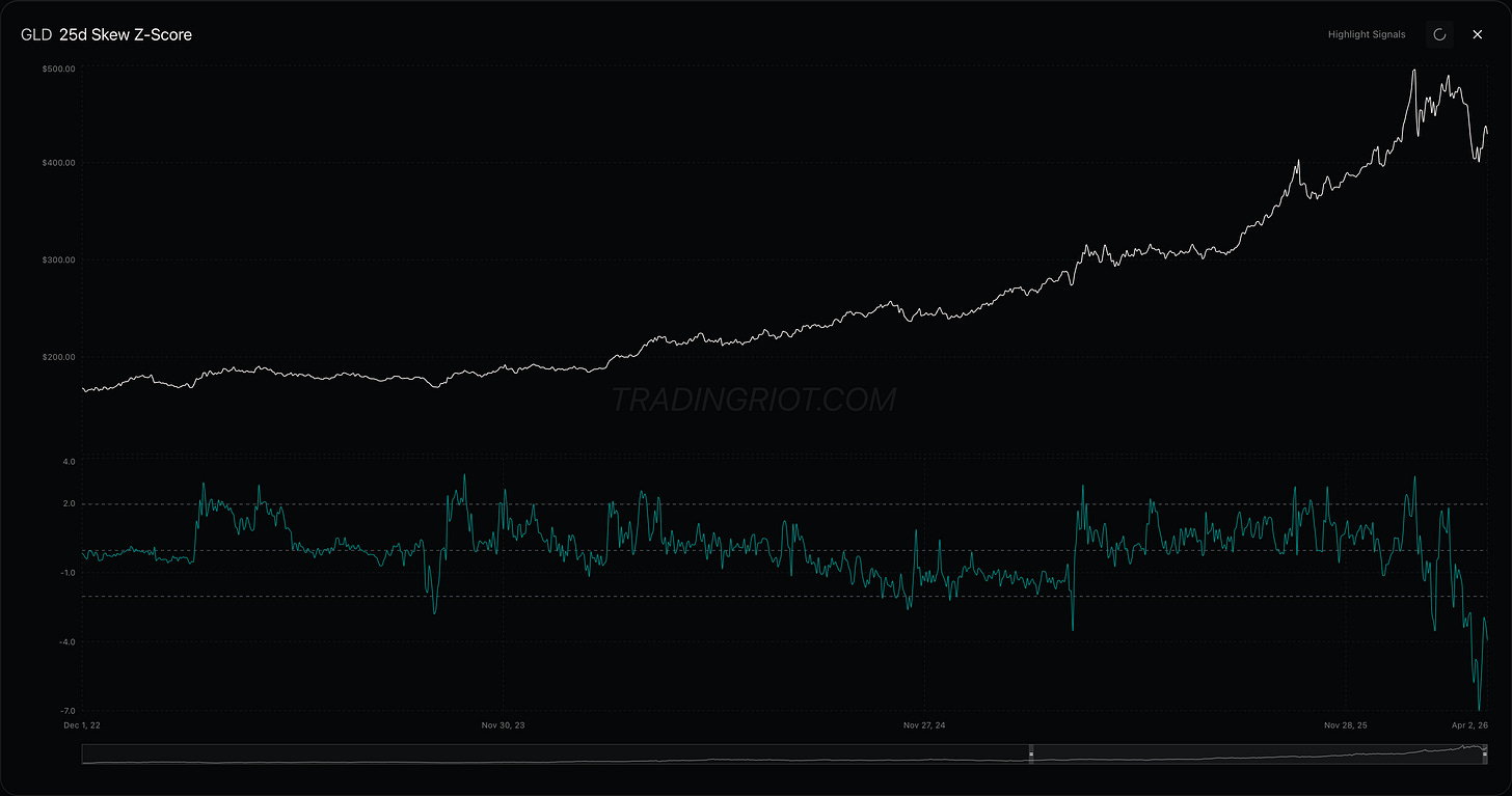 Last week I flagged the heavy put skew in gold and the opportunity in selling those puts. That turned out to be the right call as price rallied through the week. Silver followed, up 4.6% to $72.74 with a 98.4 commercial index.