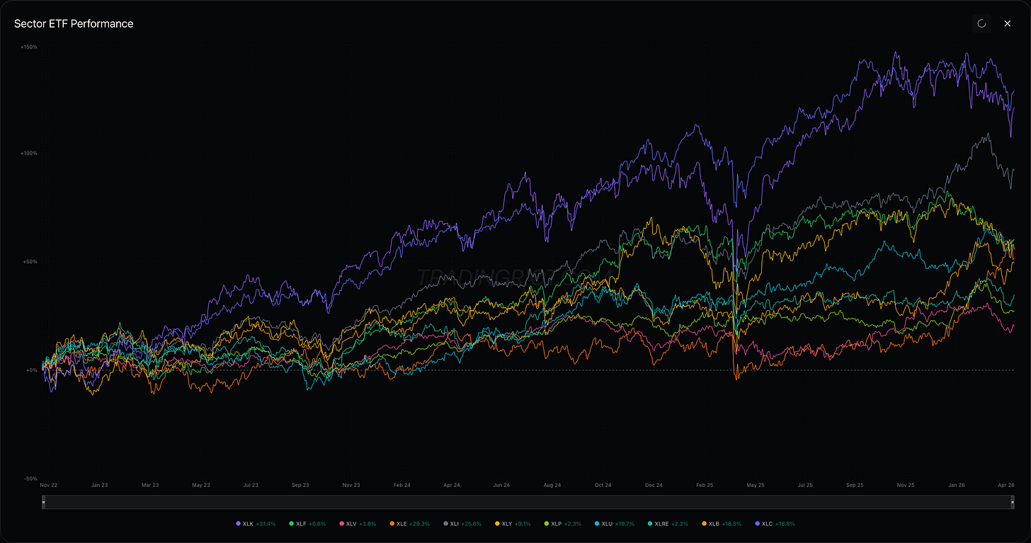 Tesla was the laggard, down 0.5% after Q1 deliveries missed at 358K versus 365K consensus, a 14% sequential drop from Q4. Nike cratered over 10% early in the week after guiding China sales down 20% annualized, a canary for the consumer discretionary complex under $4/gallon gas.