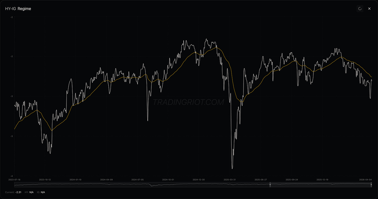 Credit actually improved. HY OAS compressed from 346bp to 316bp, IG from 93bp to 87bp. That’s the one signal arguing this correction stays orderly rather than turning systemic. Bond traders are treating the selloff as headline-driven, not fundamentally deteriorating. VIX at the 84th percentile with a flat term structure and credit tightening is signaling elevated uncertainty, but not panic.