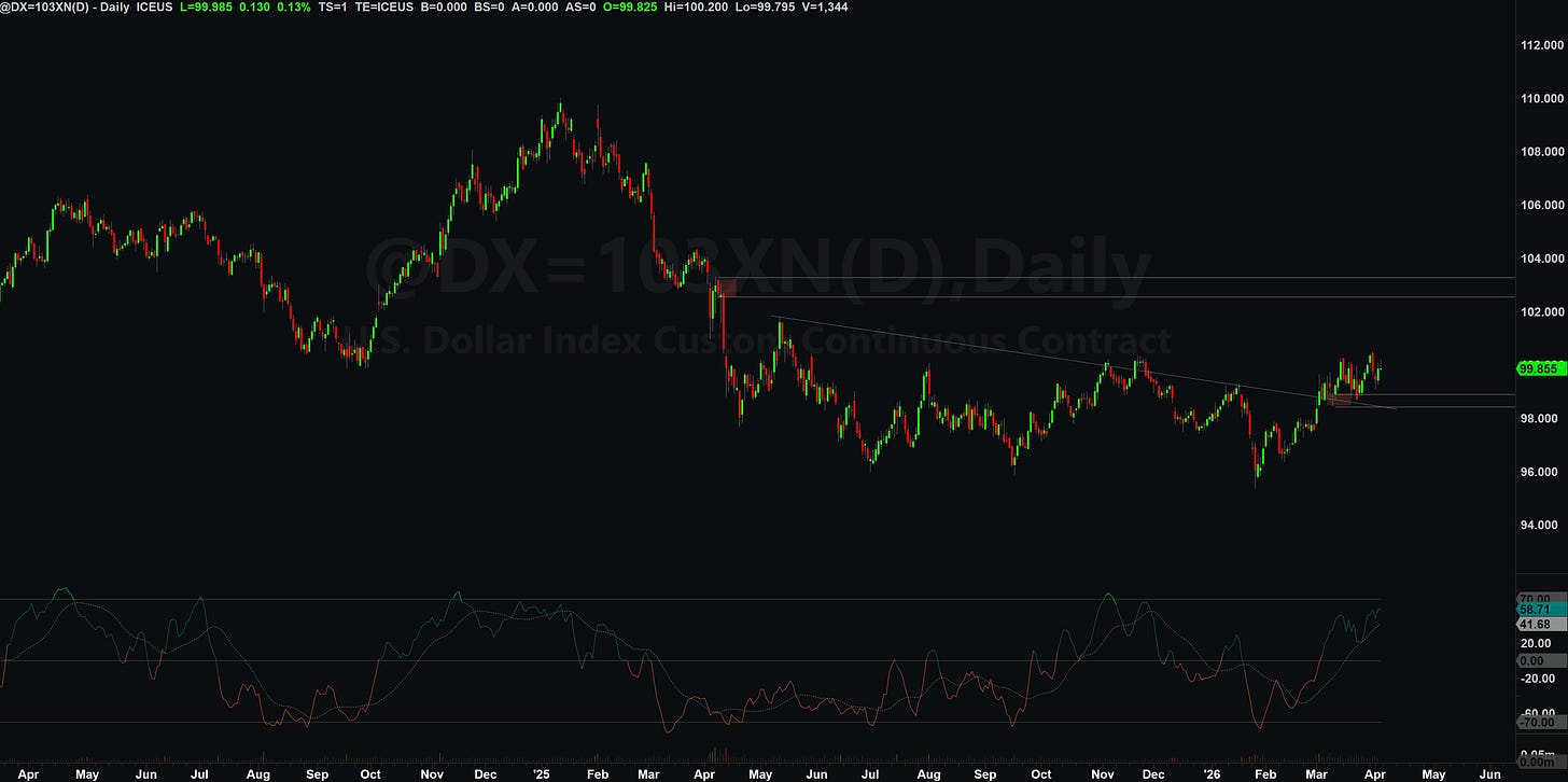 The dollar index was flat on the week but the broader trend remains up. Large speculators are long dollar futures, which normally flags a crowded trade, but reserve currency flows, the rate differential with a cutting ECB, and the fact that $110 oil means the entire world needs more dollars to buy energy keep overriding that signal. As long as 99 to 98.5 holds on DXY, I expect dollar strength to persist.