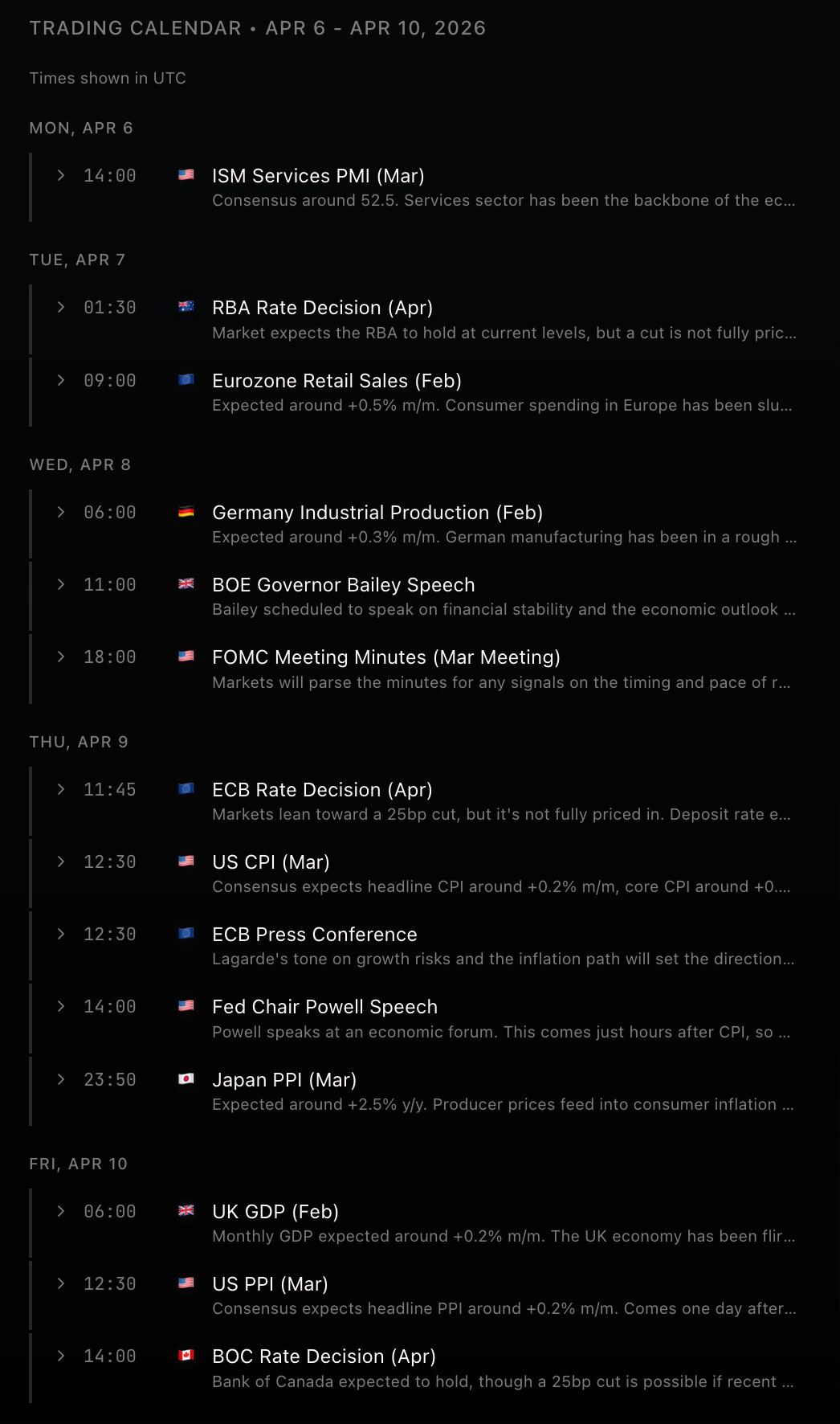 For the upcoming week, Wednesday is the day. US CPI drops in the morning, Powell speaks hours later, and the ECB delivers its rate decision right in between. Hot core CPI with a hawkish Powell reprices rates, equities, and the dollar for the rest of April. A soft print with a dovish lean rips risk assets and probably sends the 2-year through recent support.