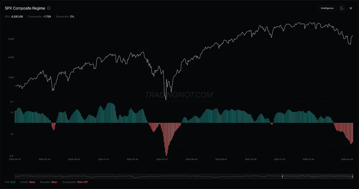 Composite regime still sitting heavily in negative, while this move down still lacking the panic leg down which is a classic SPX signature.